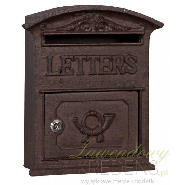 Skrzynki na listy mogą w uroczy sposób ozdobić twój dom. Żeliwna skrzynka na listy ma kolor brązowy i zamykaną na kluczyk szafeczkę z listami. Pod otworem na listy znajduje się angielski napis Letters i świetne ozdobne rzeźbienia.