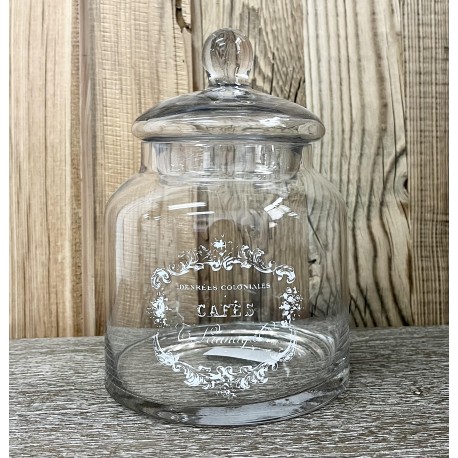 Szklany pojemnik firmy Chic Antique ma okrągły kształt i przezroczysty kolor. Posiada białe ozdobne napisy z przodu.