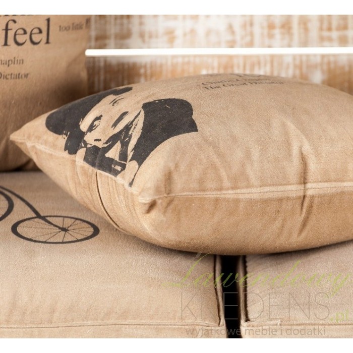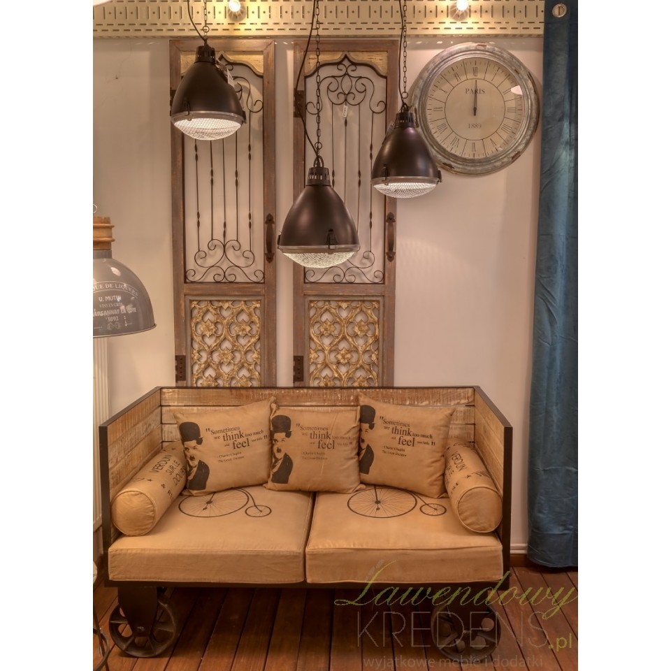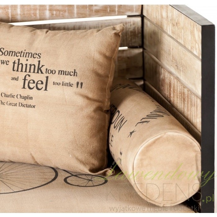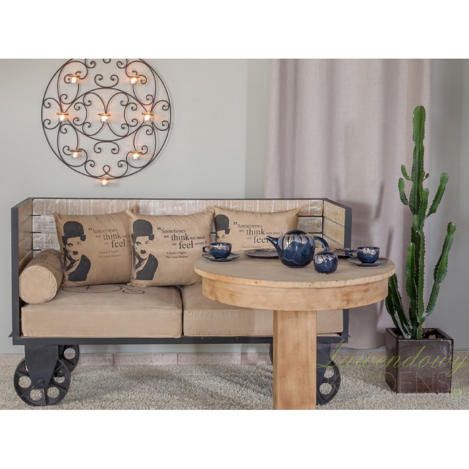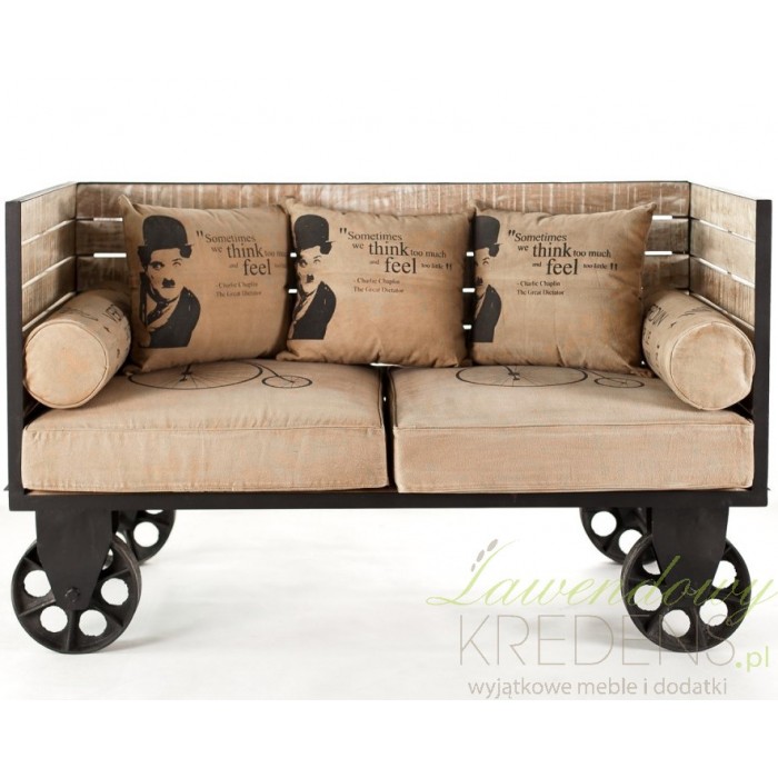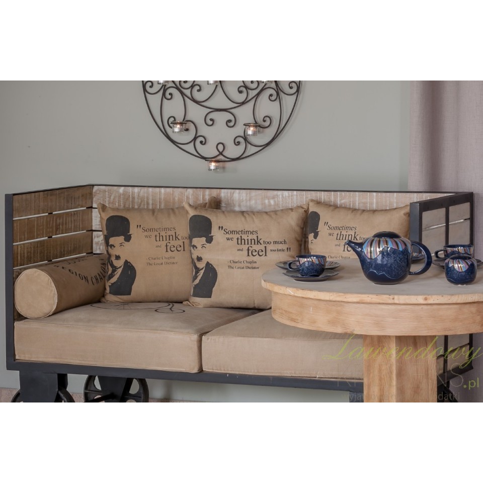 Utrzymana w kolorystyce beżu i przełamującej jednostajność czerni sofa Aluro z kolekcji mebli loftowych z miękkimi poduszkami. Jej niezwykłość zawdzięczamy połączeniu drewna, metalu i odpowiedniego materiału w doskonałych proporcjach i formie. Dodatkowo podobizna Charliego Chaplina dopełnia całokształt, tworząc iście loftową kombinację!