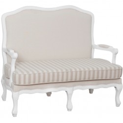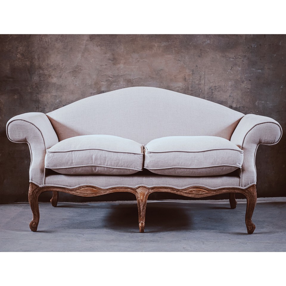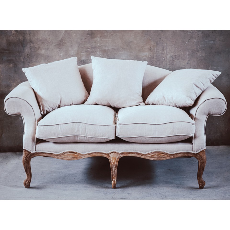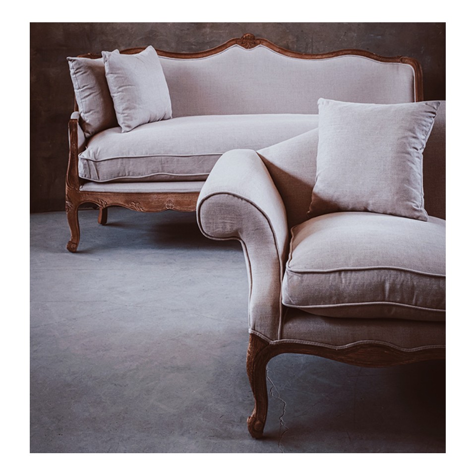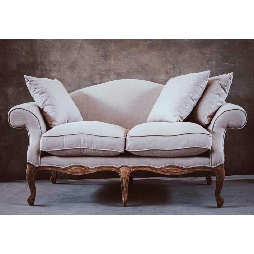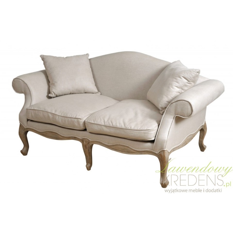 Sofa Belldeco Classic to elegancki mebel w stylu prowansalskim i ludwikowskim. Dębowa rama, beżowe lniane obicie i miękkie poduszki z wypełnieniem z pianki i pierza tworzą połączenie klasy i komfortu. Idealna do salonu w stylu rustykalnym lub francuskim.