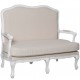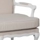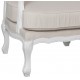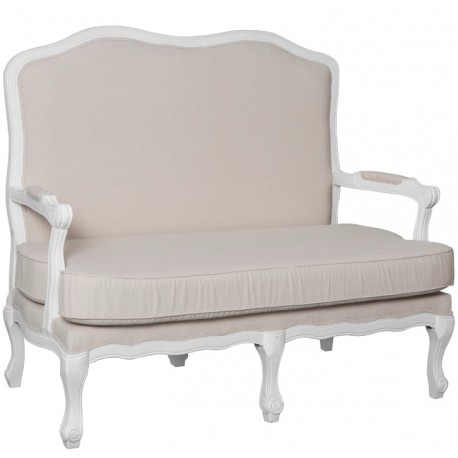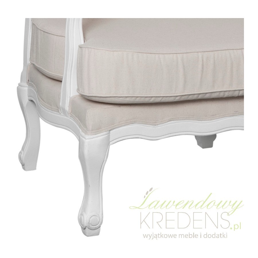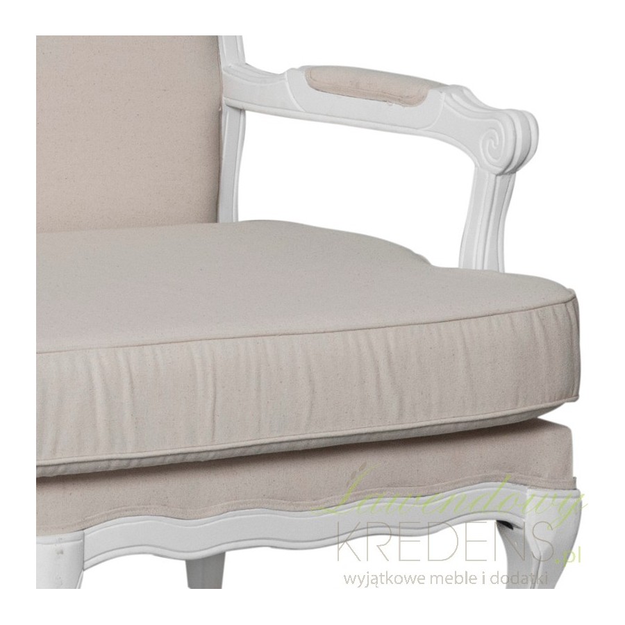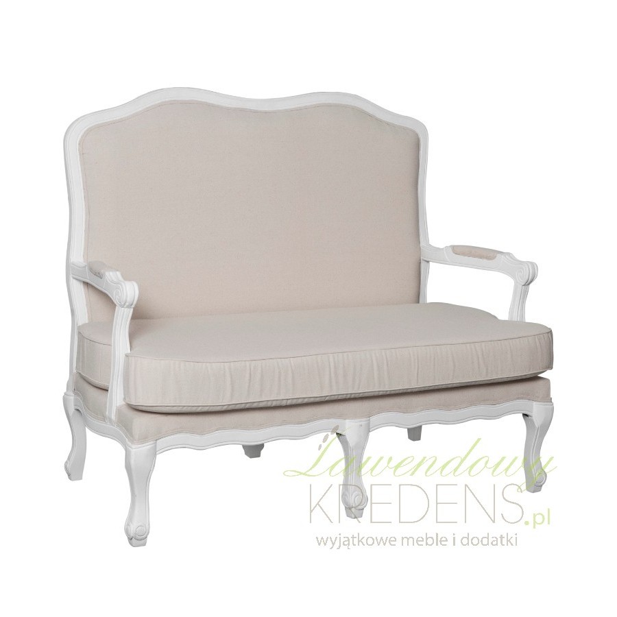 Stabilna sofa w stylu prowansalskim wsparta na sześniu, równomiernie rozłożonych nogach,zdobionych delikatnymi żłobieniami. Pokrywający powierzchnię sofy beżowy materiał doskonale komponuje się z bielą drewnianej podstawy i oparć, dając efekt luksusu i elegancji.