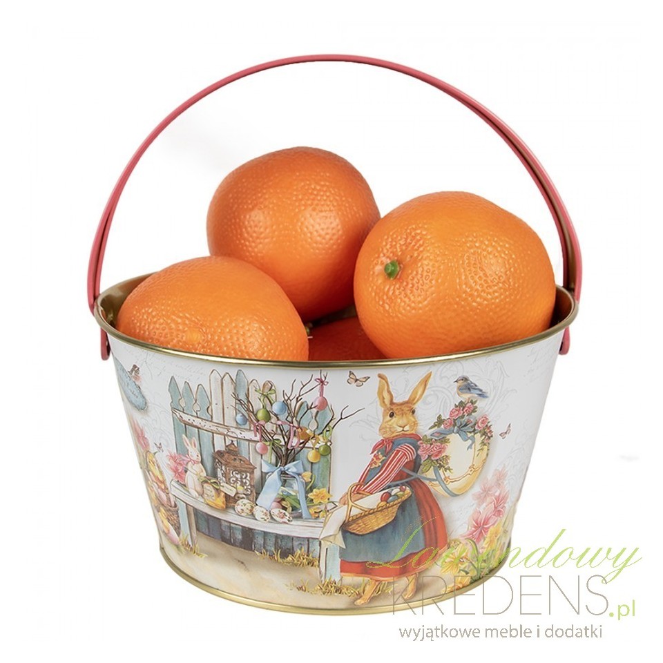 Jako dekorator wnętrz polecam go, gdy budujesz aranżację w nurcie rustykalnym, cottage albo retro. Ilustracyjny motyw króliczka i wiosennego ogrodu wprowadza opowieść, a nie „kolejny pojemnik na ozdoby”. Metalowa powierzchnia ma charakter wyrobów z duszą: lekka patyna, subtelna tekstura i „postarzany” efekt sprawiają, że koszyk wygląda spójnie z drewnem, lnem, ceramiką i szkłem z tłoczeniem.Stabilna osłonka na wiosenne kompozycje: hiacynty, narcyzy, rzeżucha