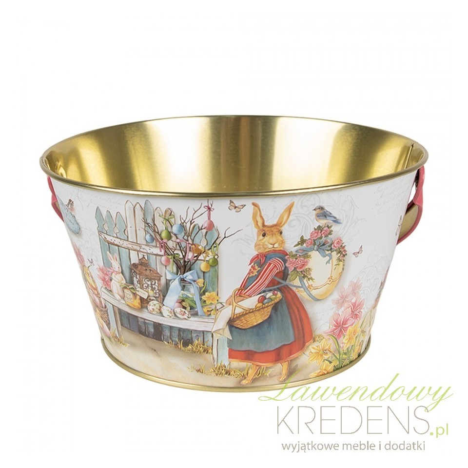 Jeśli szukasz pojemnika, który nie rozmięknie od wilgoci jak wiklinowy i jednocześnie wygląda odświętnie, ten metalowy koszyk wielkanocny spełnia oba zadania. Stabilna, szeroka bryła dobrze znosi przenoszenie zawartości, a wygodny uchwyt ułatwia drogę do kościoła lub postawienie koszyka na stole. Wnętrze w złotym tonie dodaje elegancji i podbija kolor pisanek, rzeżuchy czy bazi.Koszyk A Clayre & Eef w stylu vintage: nadruk, patyna i rzemieślniczy klimat