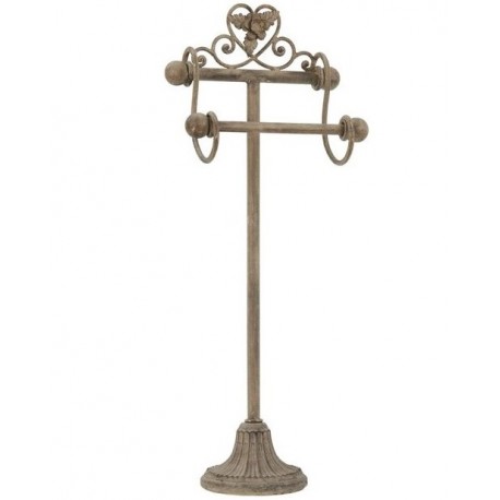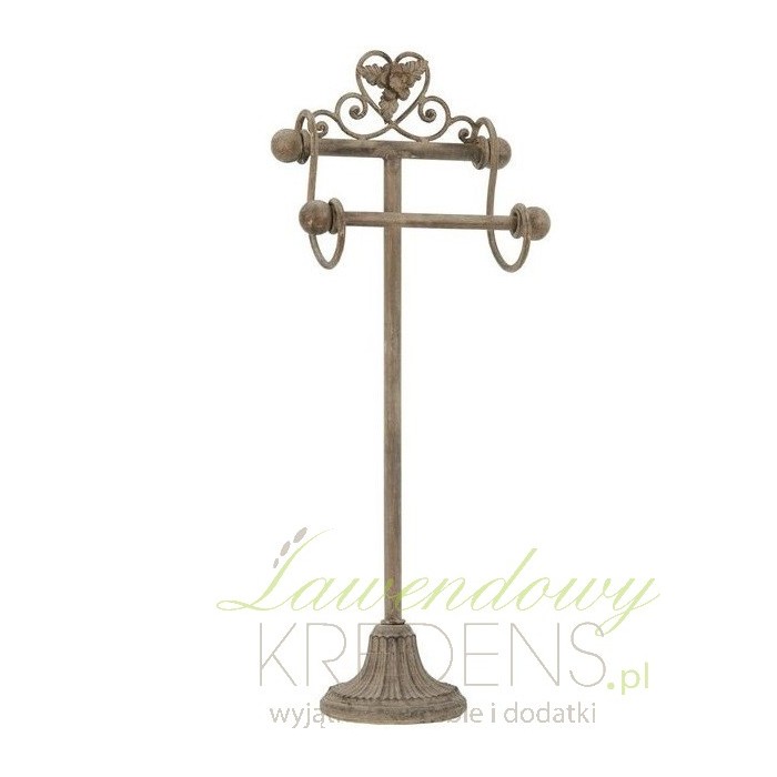 Dekoracyjny uchwyt na papier toaletowy ustawiony na wysokiej podstawie, co czyni go bardziej funkcjonalnym i ustawnym. Stojak na papier zakończony został trójwymiarową ozdobą z motywem serca z prętów i niewielkiej, metalowej różyczki. Stonowany kolor powierzchni dopełnia kreacji!