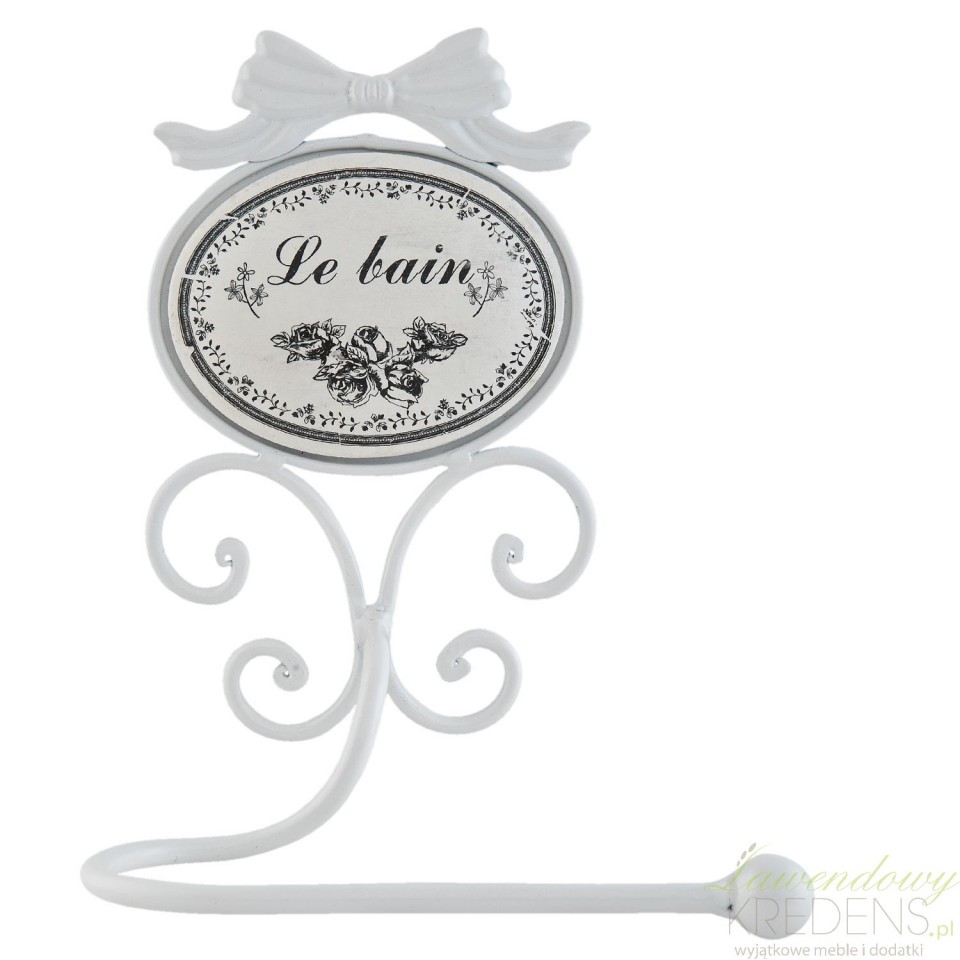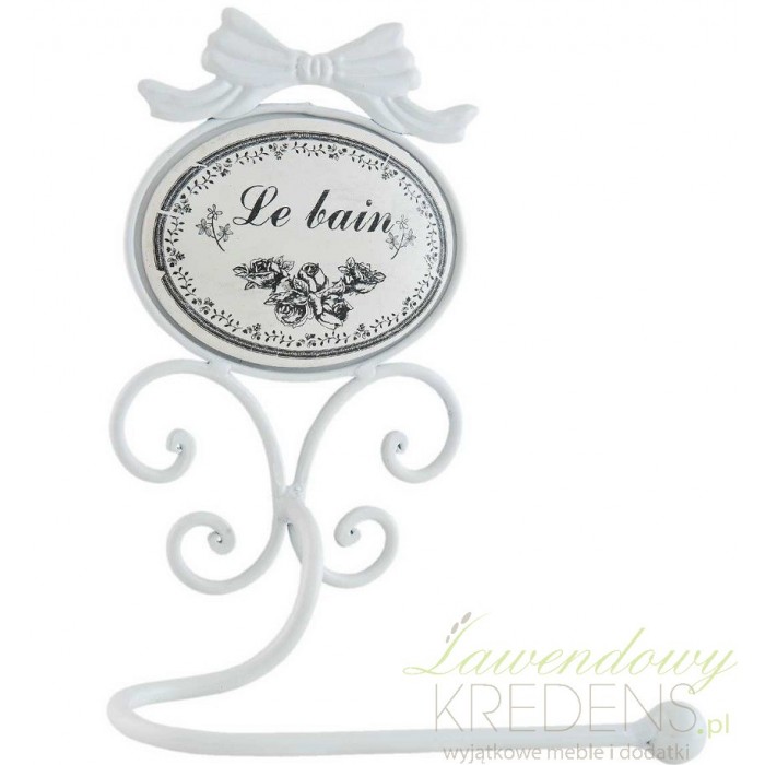 Ozdobna forma uzyskana została przez specjalnie powyginane pręty i dołączone do nich dodatki: czarno-biały znaczek z napisem Le bain oraz uroczą kokardą.