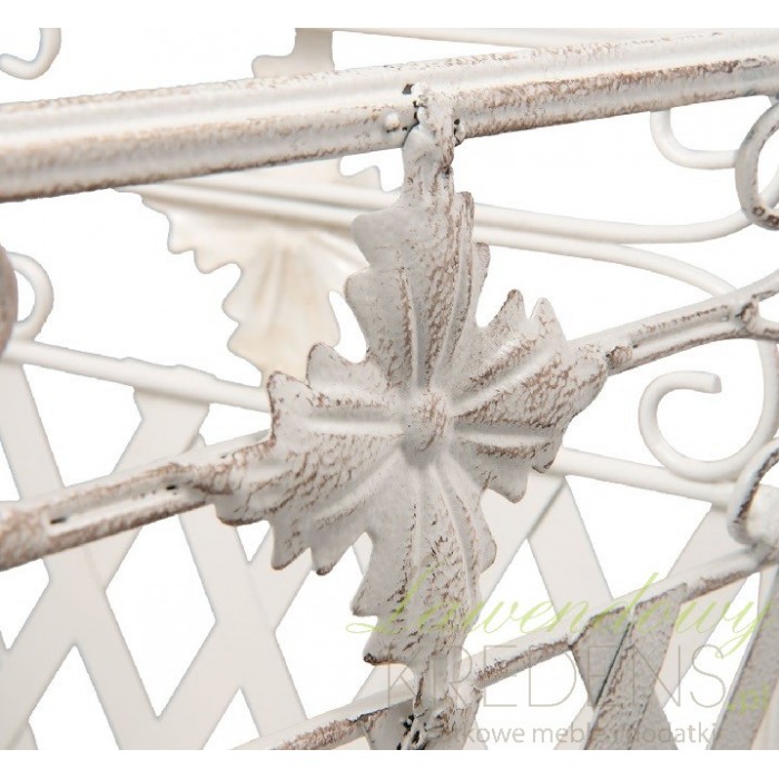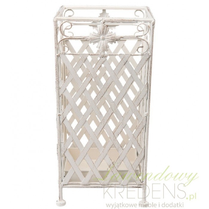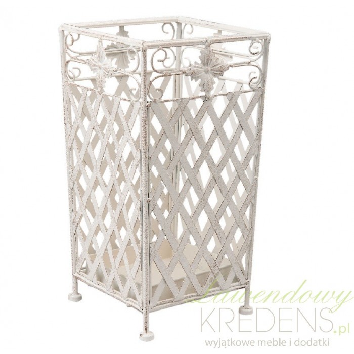 Stojak na parasole przypomina kosz i ma piękny kolor antycznej bieli. Wykonany jest z dobrej jakości metalu i ma śliczny dekoracyjny wzór. Ma kwadratowy kształt i urocze ozdobne kwiaty. Dodatki do domu to cudowna i piękna dekoracja wnętrza.