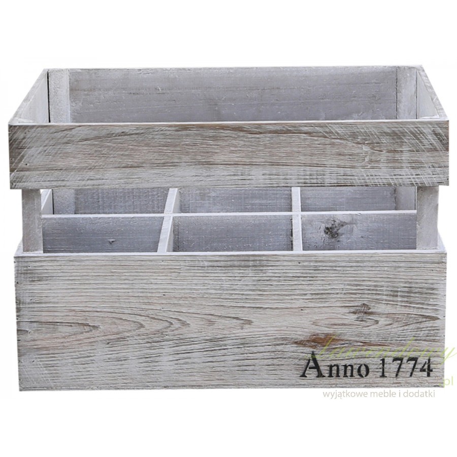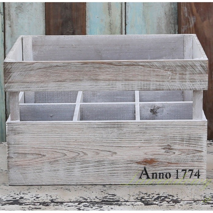 Drewniana, bielona na powierzchni zewnętrznej skrzynka na butelki z nadrukowanym napisem Anno 1774. Jej specjalna konstrukcja pozwala na łatwe jej przenoszenie, a dodatkowo dzięki wolnej przestrzeni między deskami dobrze widać etykiety znajdujących sie w niej butelek. Świetna na ekspozycję jak i do przechowywania butelek w piwniczy czy na struchu!