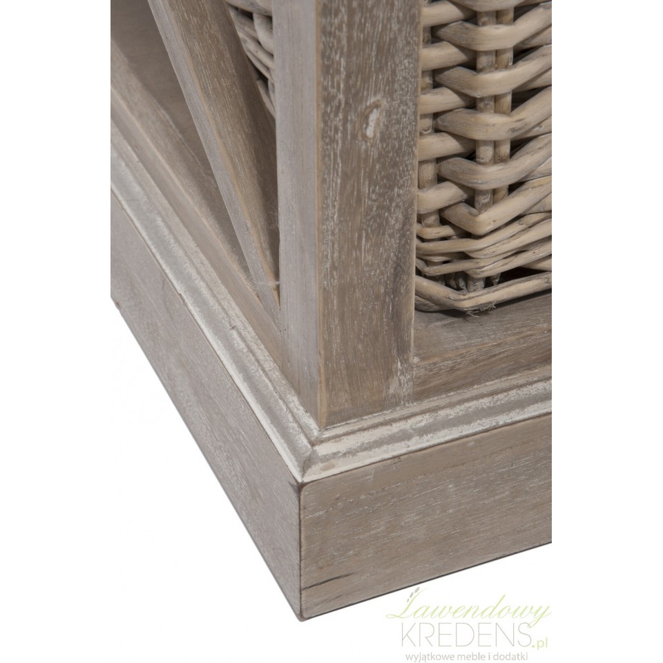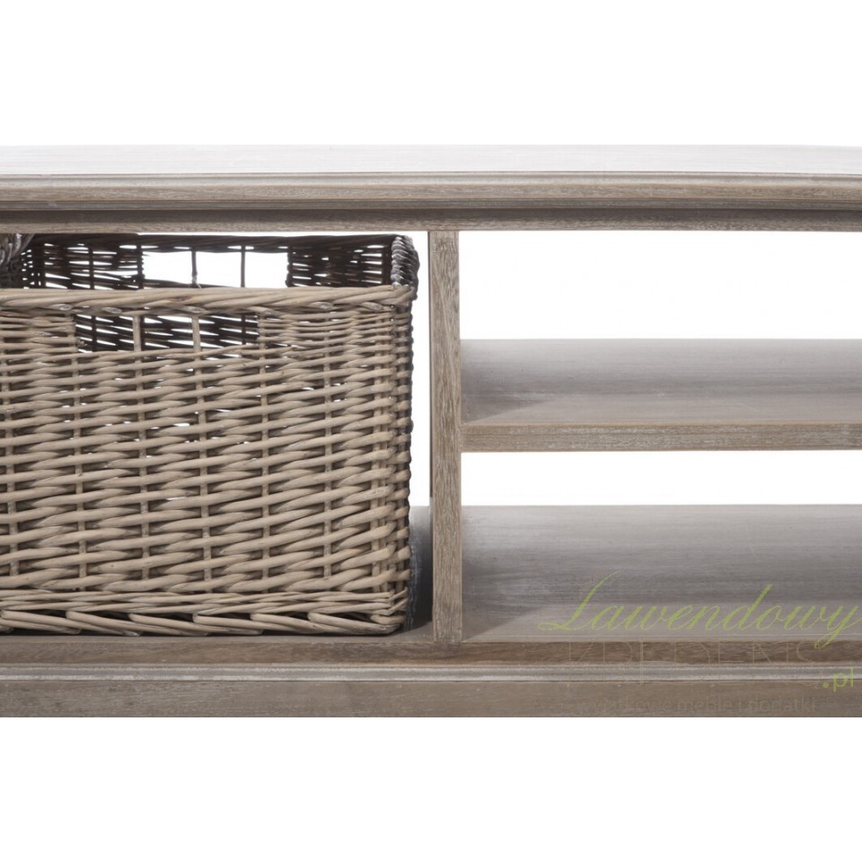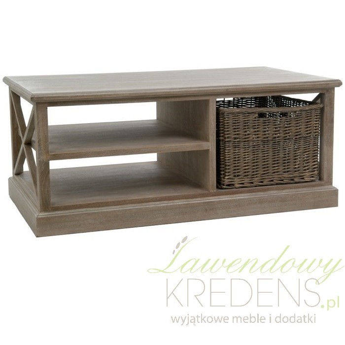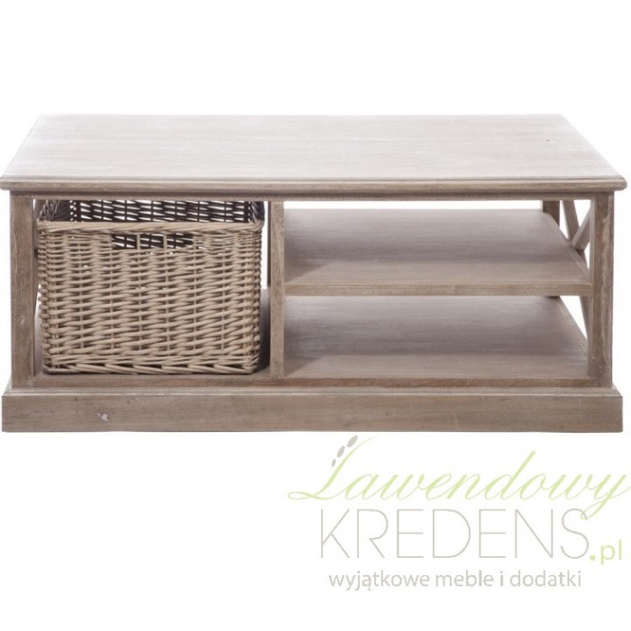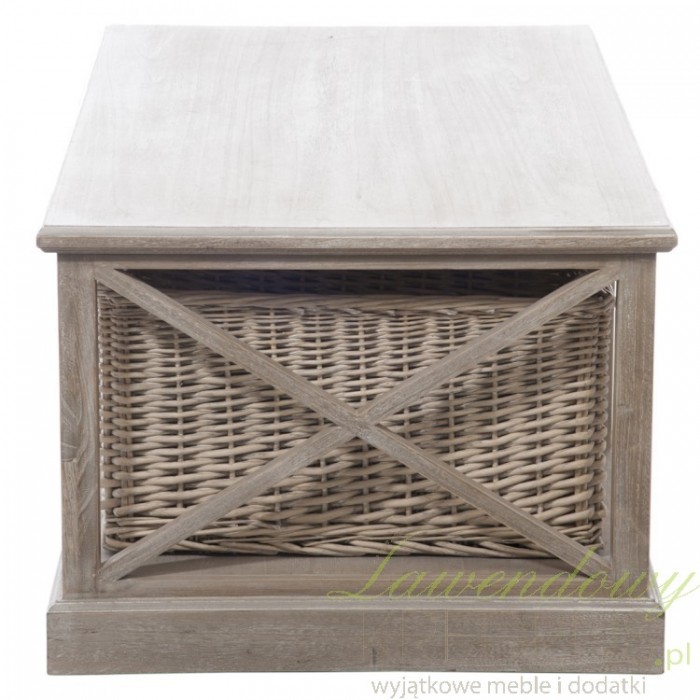 Niski stolik kawowy to propozycja dla miłośników wyjątkowych mebli francuskich. Stolik z koszami sprawdzi się w rodzinnym salonie jako miejsce do popołudniowych spotkań przy kawie. Stabilna podstawa mebla gwarantuje udane spotkania, a szerokie półki i pojemne kosze dają możliwość przechowywania wielu akcesoriów. Drewniany stolik w kolorze brązu nie przytłoczy wnętrza, a jedynie podkreśli jego charakter.