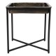 Czarny stolik loft metalowy zamiast płaskiego blatu ma przymocowaną głęboką misę, której powierzchnia jest dogłębnie postarzona, o czym świadczą rdzawe przetarcia widoczne wewnątrz i na zewnątrz.