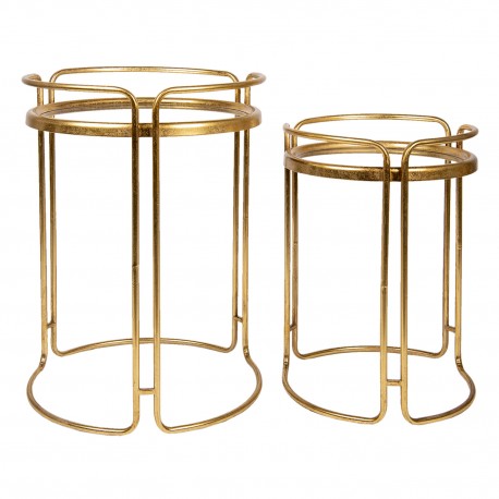 Marka Clayre & Eef zajmuje się wzbogacaniem domów naszych klientów poprzez kreatywne, stylowe i niepowtarzalne meble oraz dekoracje. Ten zestaw stolików kawowych to idealny duet do Twojego salonu, sypialni, przedpokoju lub innego pomieszczenia, w którym przyda się dodatkowe miejsce na ozdoby lub do serwowania kawy niespodziewanym gościom. Złote stoliki z lustrzanymi blatami mają błyszczące wykończenie, dzięki któremu uzyskują elegancki, modny wygląd. Złote meble metalowe, w tym stoliki kawowe to strzał w dziesiątkę jeśli planujesz urządzić efektowne wnętrze.
