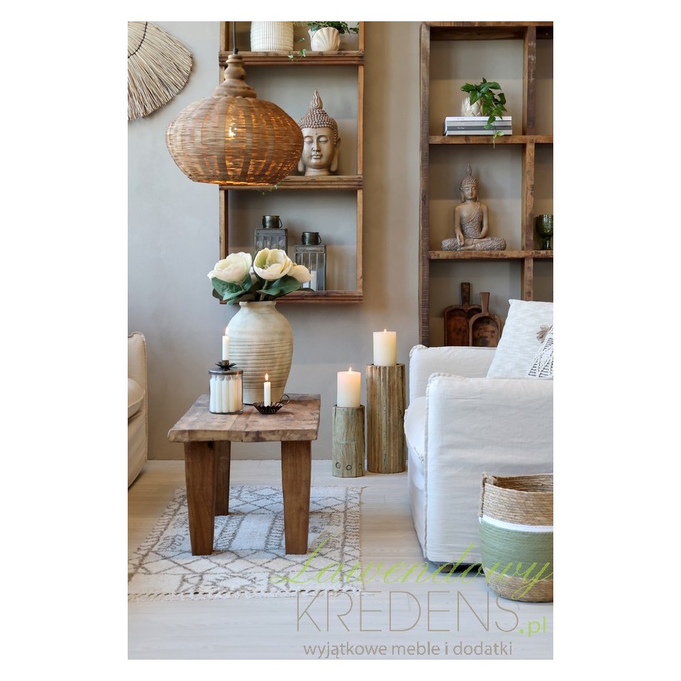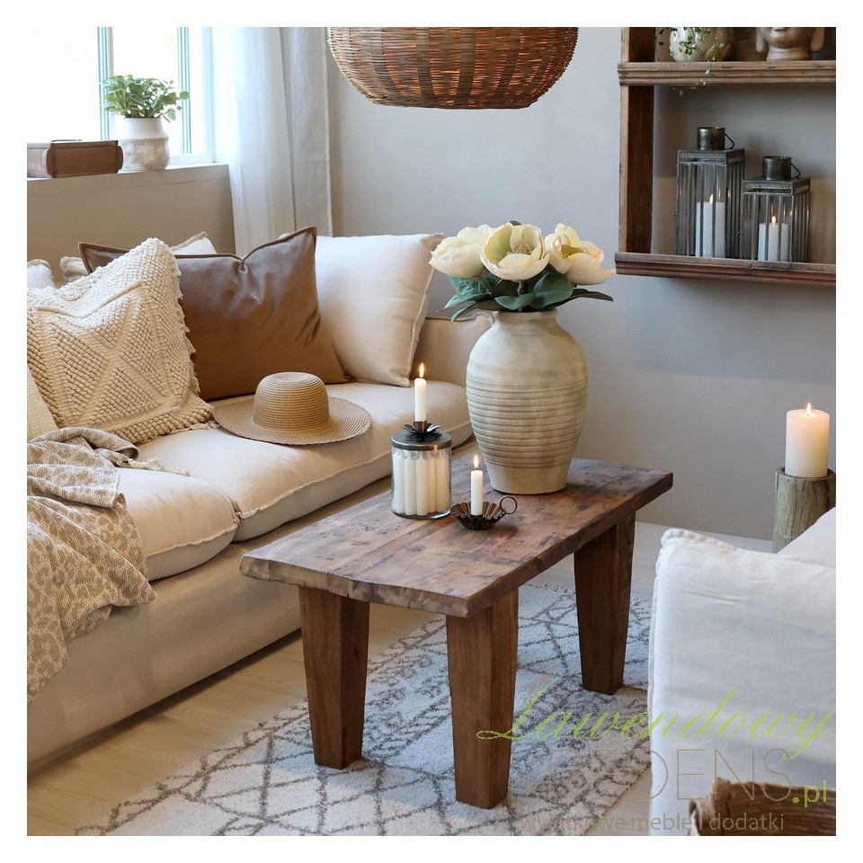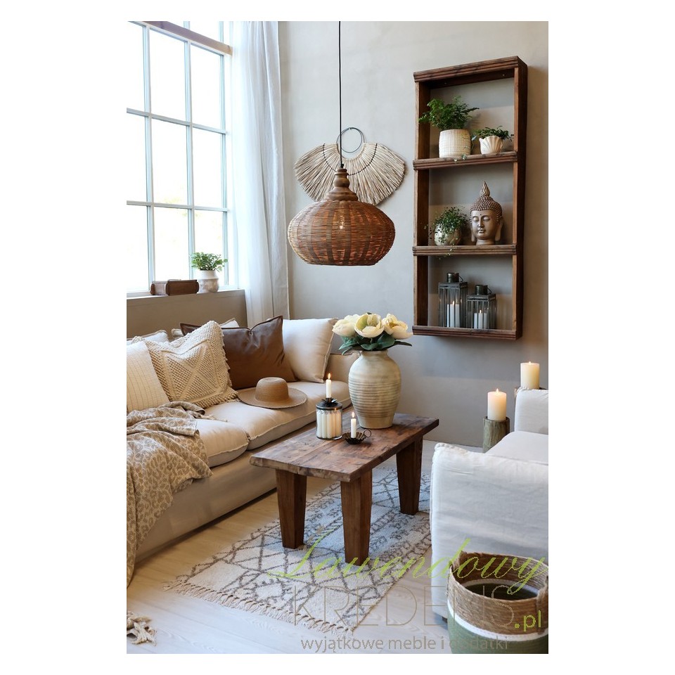 Stolik Grimaud łączy w sobie trzy nurty stylistyczne – rustykalny, japandi oraz boho. Jego surowa forma bez zbędnych ozdobników idealnie wpisuje się w estetykę japandi, gdzie prostota spotyka się z naturalnym ciepłem. Z kolei wyraźne ślady ręcznego wykonania i organiczny wygląd przywołują klimat wiejskiej sielanki, tak charakterystyczny dla stylu rustykalnego. Natomiast lekkość konstrukcji i możliwość zestawienia go z plecionkami, lnem i roślinami doniczkowymi sprawiają, że doskonale odnajdzie się również we wnętrzach boho.