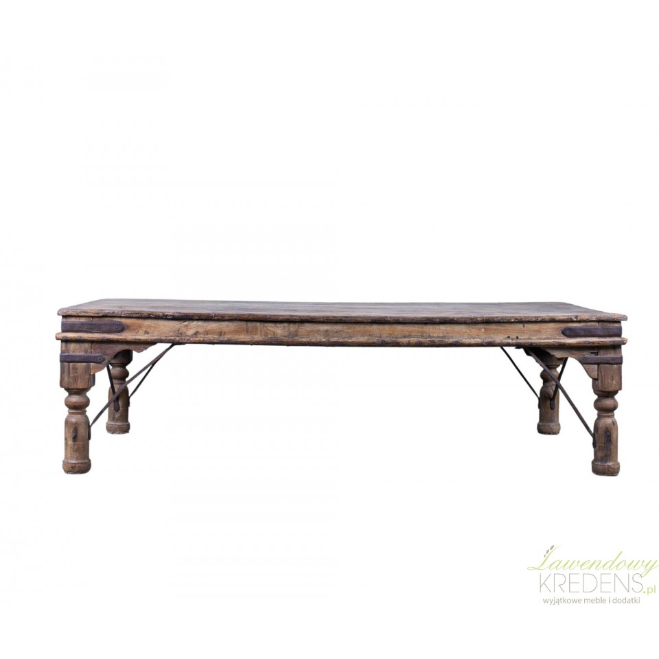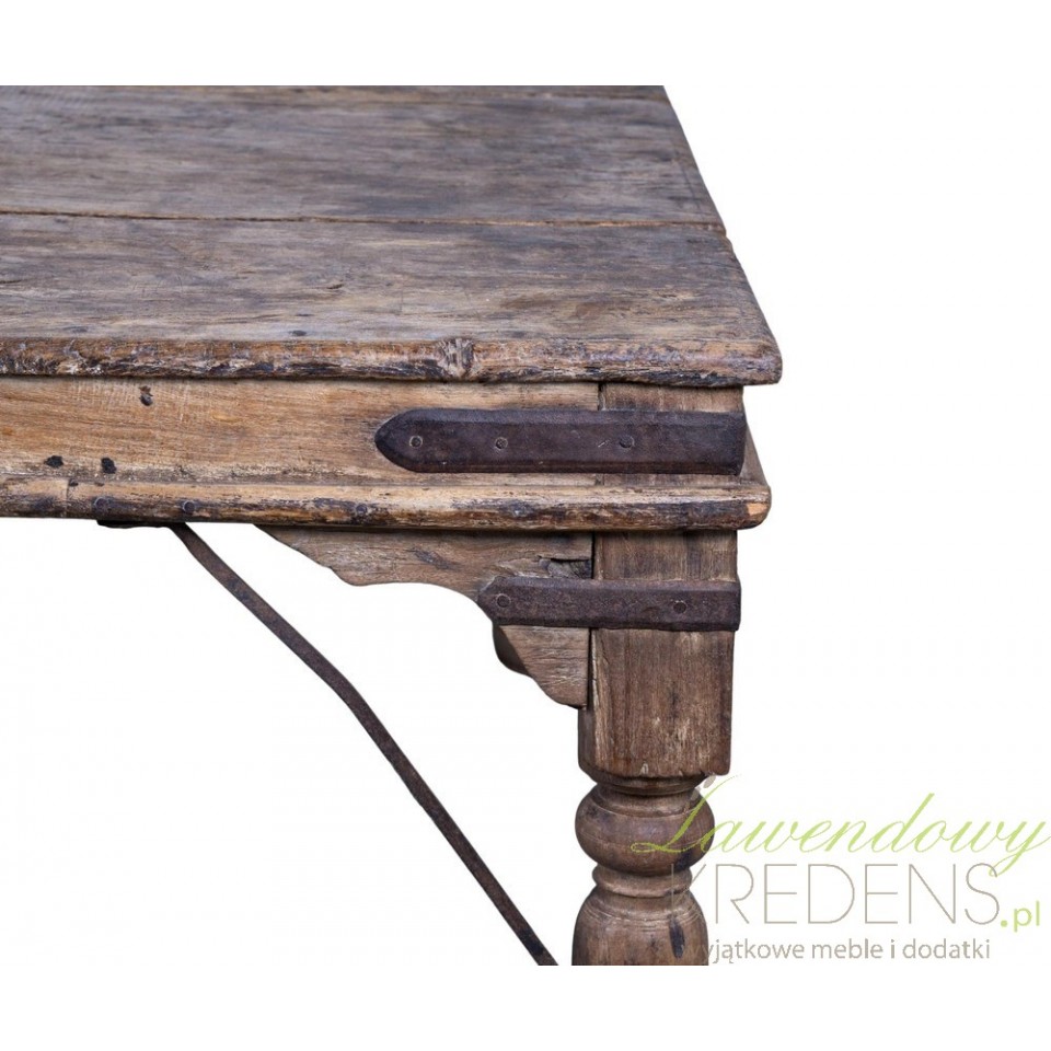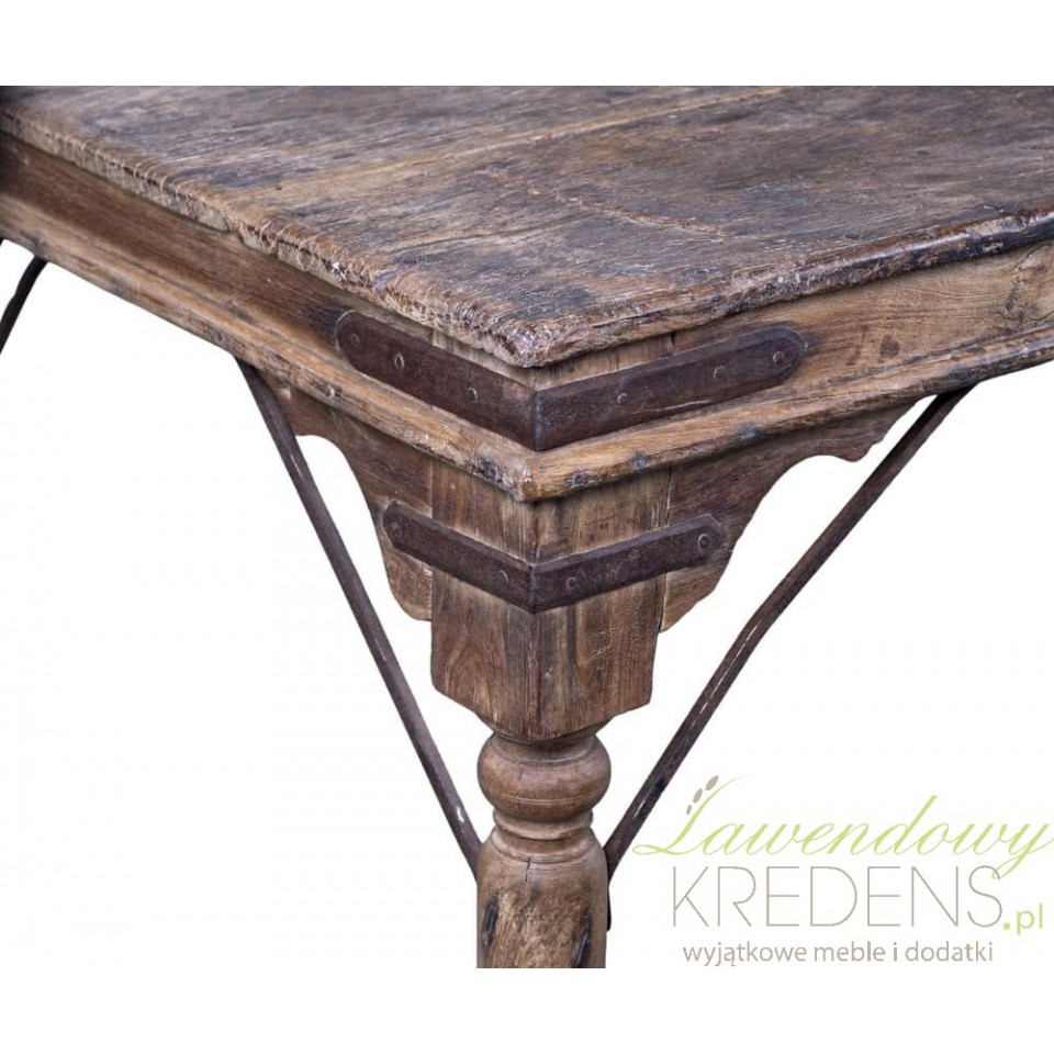 Blat z grubych desek, wsparty na masywnych, toczonych nogach i wzmocniony metalowymi wspornikami, prezentuje solidność w stylu dawnych manufaktur. Ciepły, brązowy odcień drewna przywołuje atmosferę minionych lat i wnosi do wnętrza naturalne ciepło.