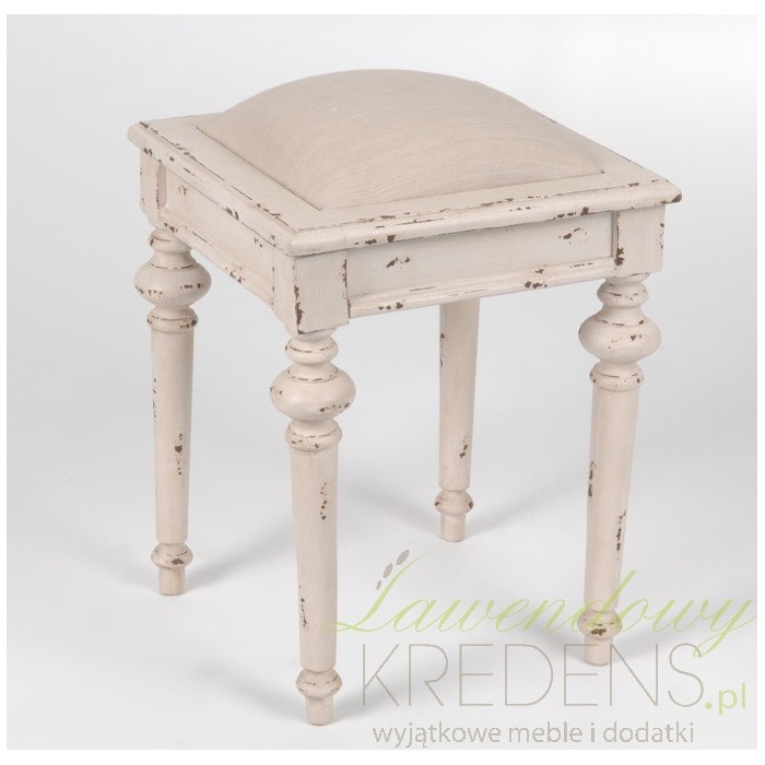 Taboret w stylu prowansalskim z miękki siedziskiem tapicerowanym jasnym materiałem, kolorystycznie zbliżonym do drewnianych elementów. Tak dostojny mebel pomocniczy doskonale sprawdzi się w przedpokoju lub w garderobie. Postarzany taboret prowansalski formą wykonania nawiązuje do pałacowych aranżacji. Meble prowansalskie polecamy również artystom do nietypowych sesji zdjęciowych.