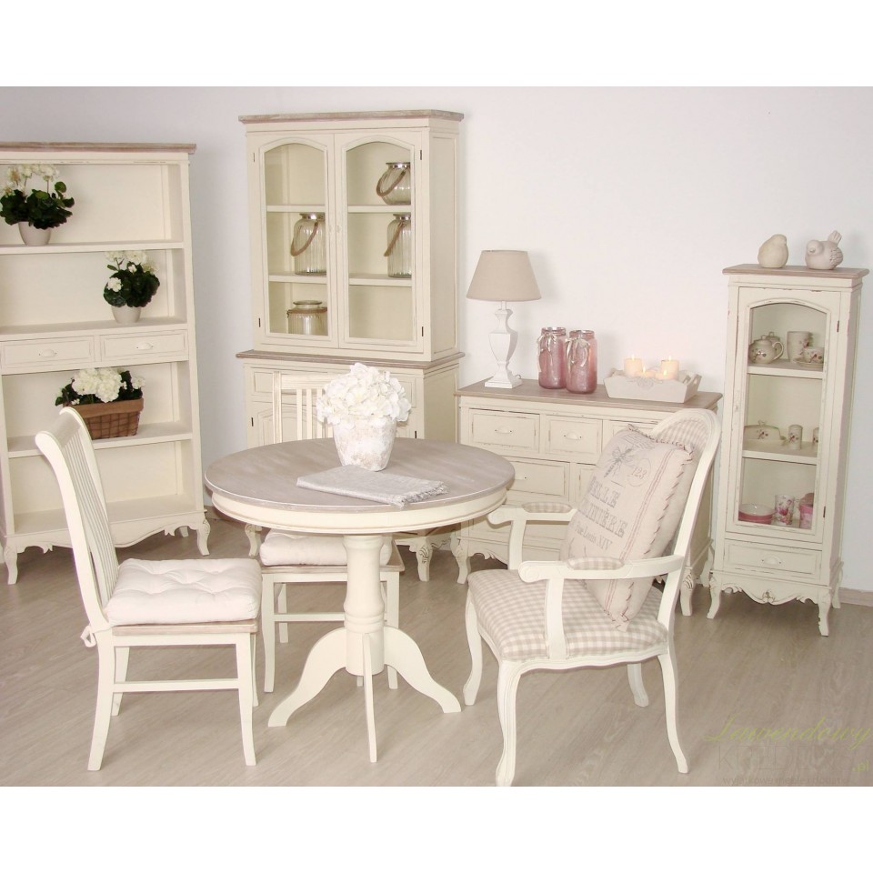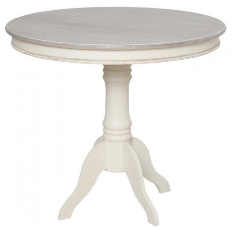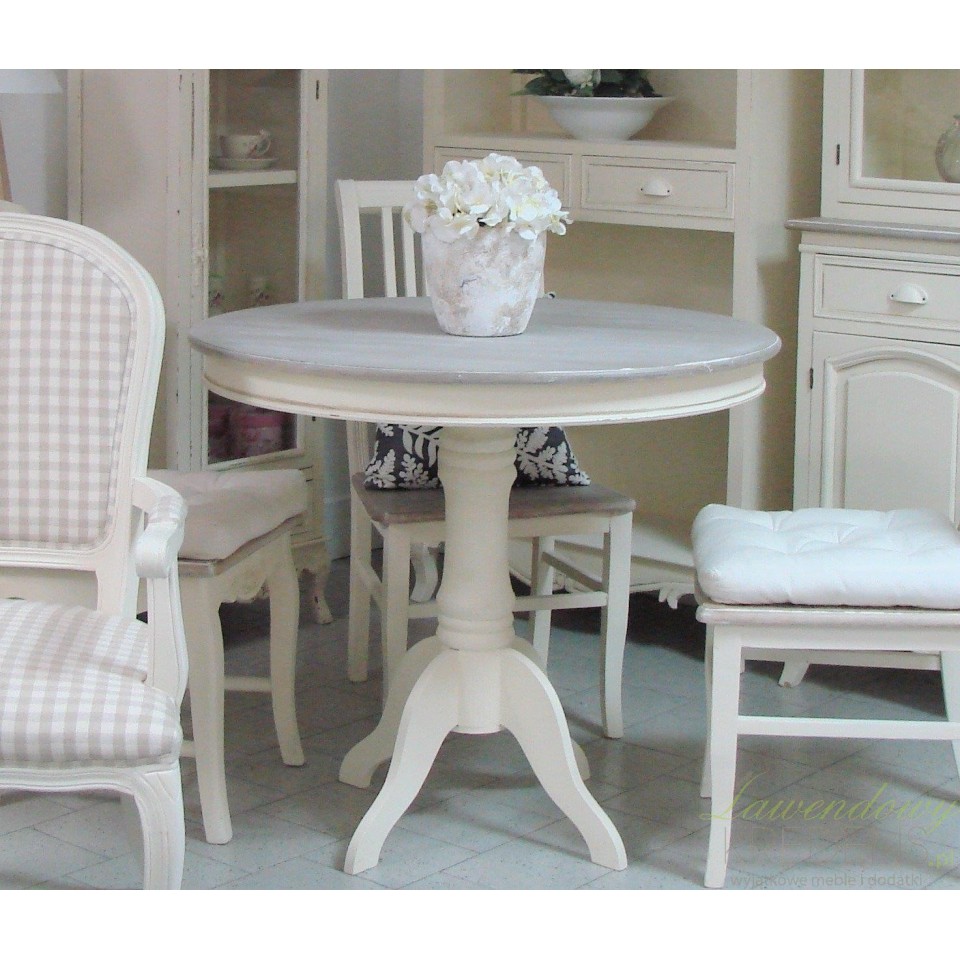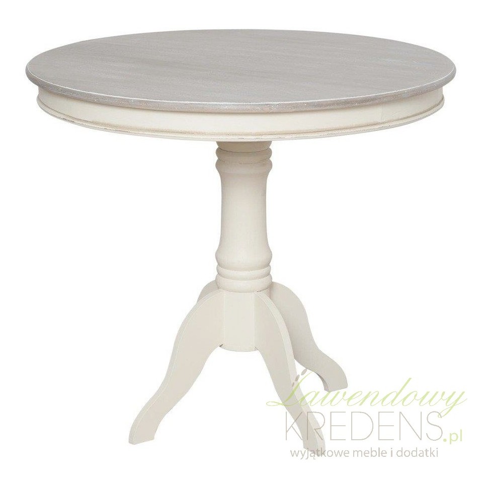 Piękny, okrągły stół w stylu francuskim na jednej nodze. Podstawa stołu ma kremowy kolor z nieregularnymi przetarciami farby.