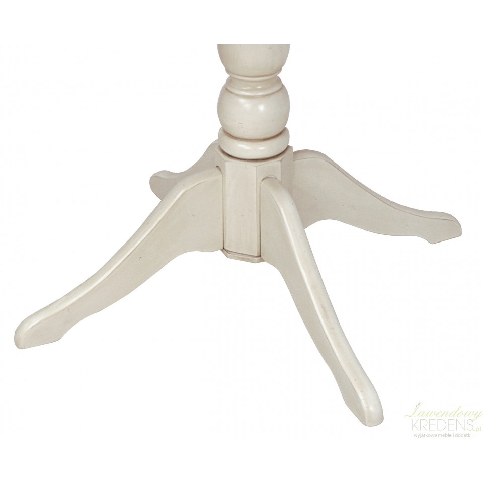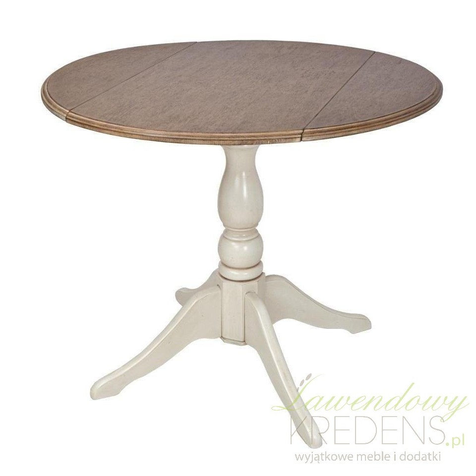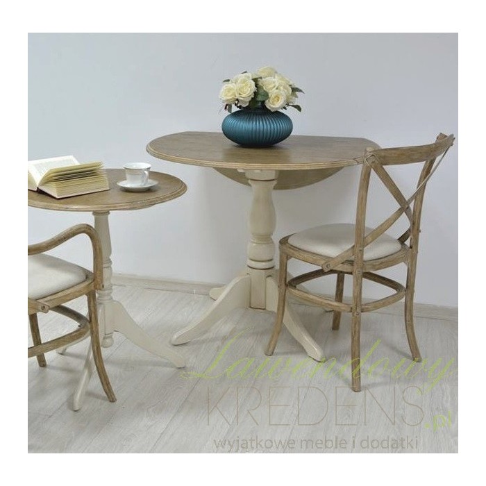Brzozowy, okrągły stolik w stylu prowansalskim, wykonany w neutralnej, brązowo-kremowej kolorystyce, któego wielkim atutem jest możliwość złożenia blatu. Specjalna konstrukcja pozwala od ręki złożyć jedną lub dwie części stołu, tak, aby stolik można było bez problemu dosunąć do ściany!