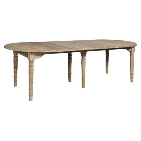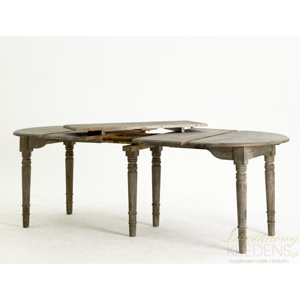 Duży stół Belldeco pochodzący z przepięknej serii Classic wykonany ze szczotkowanego drewna dębowego. Drewno to jest szczotkowane, czyli celowo postarzane poprzez utworzenie w jego litej warstwie płytkich rowków, wyczuwalnych w dotyku. Jest także lekko bielone, dzięki czemu słoje drewna są pięknie wyeksponowane. Stół Classic Duży jest bardzo funkcjonalny, ponieważ jest rozkładany o cztery dodatkowe blaty o szerokości 40cm. Na zdjęciu widoczny jest stół maksymalnie rozłożony, a podane wymiary są wymiarami po rozłożeniu. Po złożeniu stół ma kształt koła o średnicy 110cm. Stoły Belldeco to piękne meble prowansalskie, które dodadzą uroku i elegancji każdemu wnętrzu.