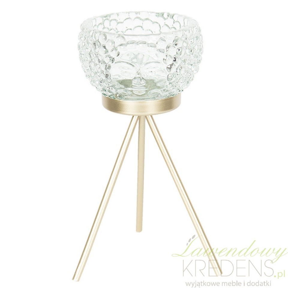 Stojący na metalowym trójnogu w złotym kolorze, szklany świecznik na tealight stanie się najpiękniejszą ozdobą podczas romantycznej kolacji we dwoje lub rodzinnej uroczystości.