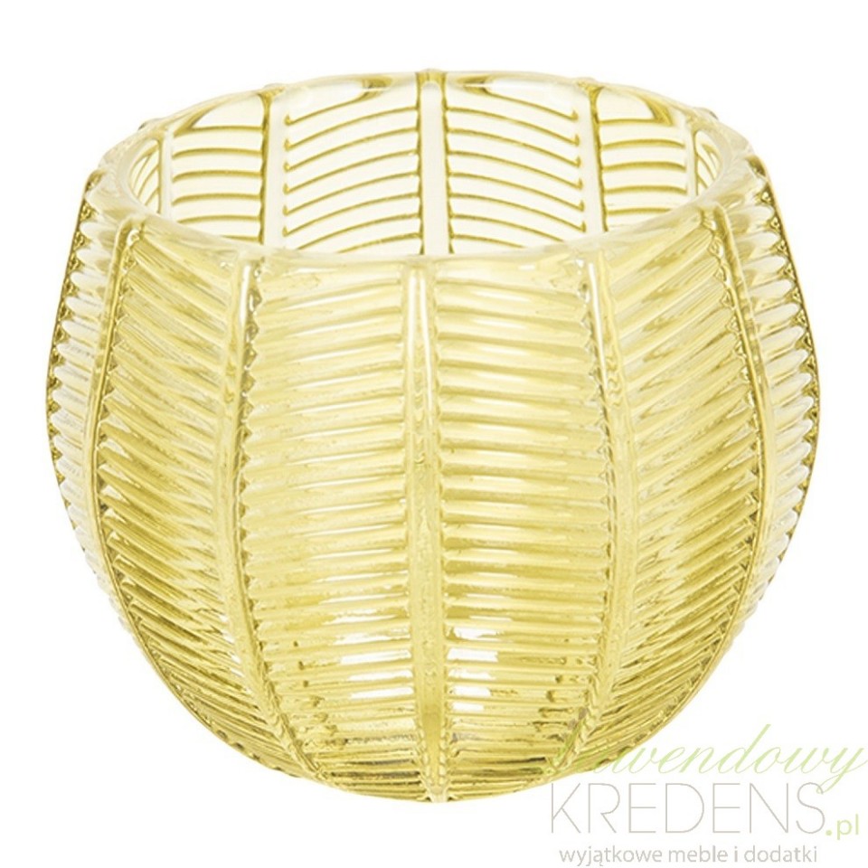 Wyrazisty, żółty odcień sprawia, że szklany świecznik na tealight jest wyrazisty, co dodaje mu szyku i pozwala wyróżnić się w każdej aranżacji. Jak na przedmiot o tak niewielkich rozmiarach świecznik jest bardzo stabilny. Na co dzień może zdobić półkę ścienną, ale równie dobrze sprawdza się na stole w jadalni podczas rodzinnego przyjęcia lub kolacji. Świecznik posiada ciekawą fakturę z wzorem w drobne kreski.c