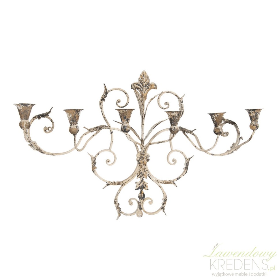Jeśli szukasz prowansalskiego, postarzanego świecznika, to ten będzie ciekawym elementem pozwalającym na stworzenie niepowtarzalnej atmosfery. Świecznik ścienny w stylu prowansalskim przeznaczony na sześć świeczek wykonano w całości z metalu. Prowansalski świecznik, poza antycznym designem wyróżnia fantazyjna forma, którą stanowią esowate ramiona zdobione metalowymi liśćmi. W okresie świąt możesz ozdobić prowansalskie świeczniki za pomocą gałązek świerkowych.