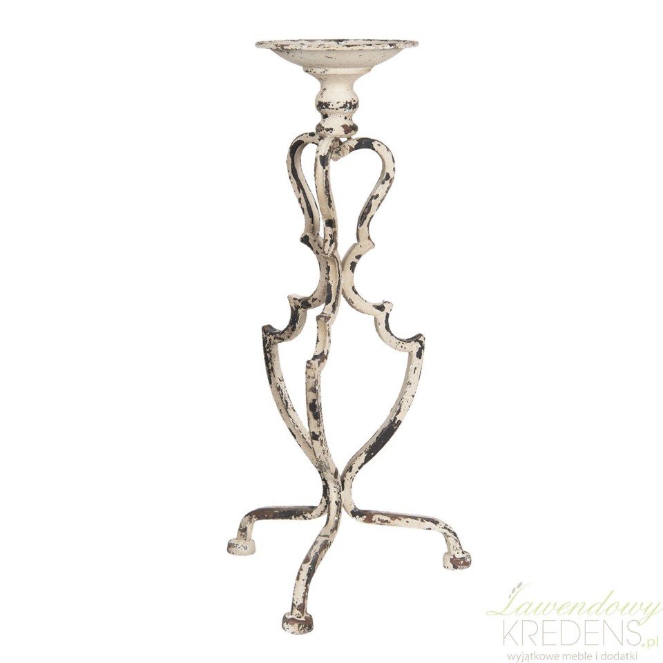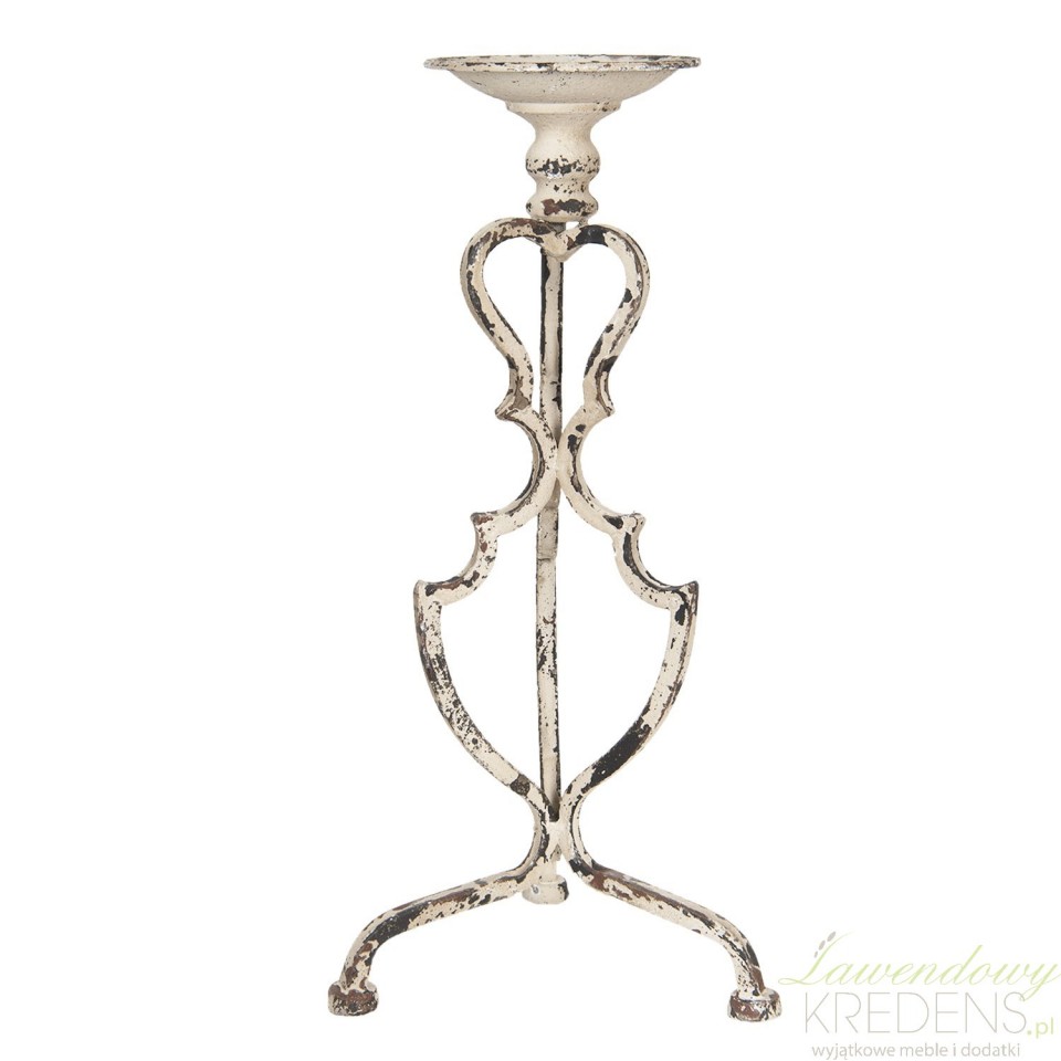 Wysoki, pojedynczy świecznik w stylu prowansalskim o powierzchni z celowymi opryskami i przetarciami kremowej farby. Zarówno jego kształt jak i stylizowana powierzchnia są inspirowane starymi czasami i dodają świecznikowi romantycznego charakteru. Postawiony na stole, parapecie lub komodzie pozwoli zbydować we wnętrzu romantyczny nastrój.
