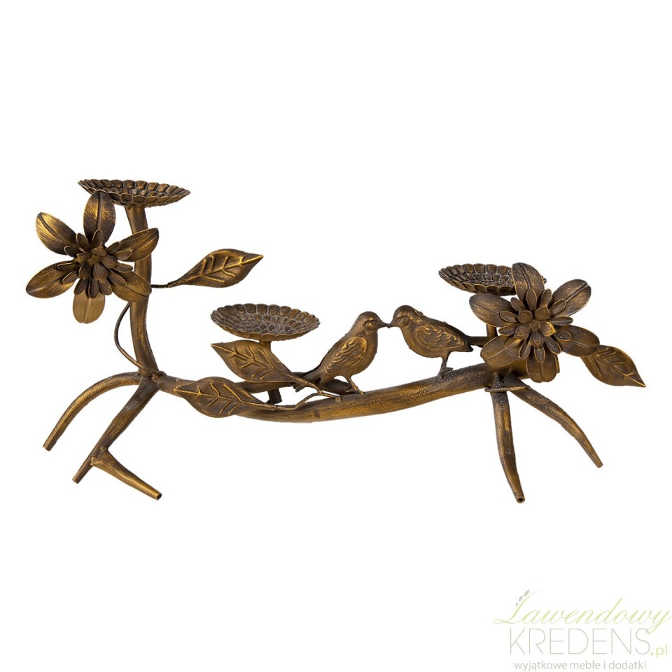Świeczniki metalowe od Clayre & Eef to dekoracje do domu dostępne w wielu rozmiarach i formach, które uczynią Twoje wnętrze zaczarowanym zakątkiem, w którym zawsze wyczuwalna jest przyjemna atmosfera. Świecznik w stylu prowansalskim miedziany z okrągłymi podstawkami na trzy świece przypomina swoim kształtem podłużną gałązkę, na której wśród liści i kwiatów spotkały się dwa małe ptaszki. Prezentowany świecznik stołowy w kolorze miedzianym to jeden z przedmiotów, który podkręca prowansalski klimat.