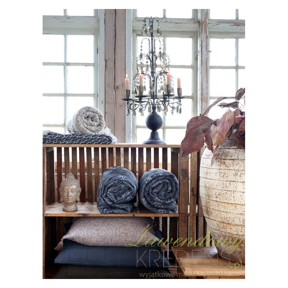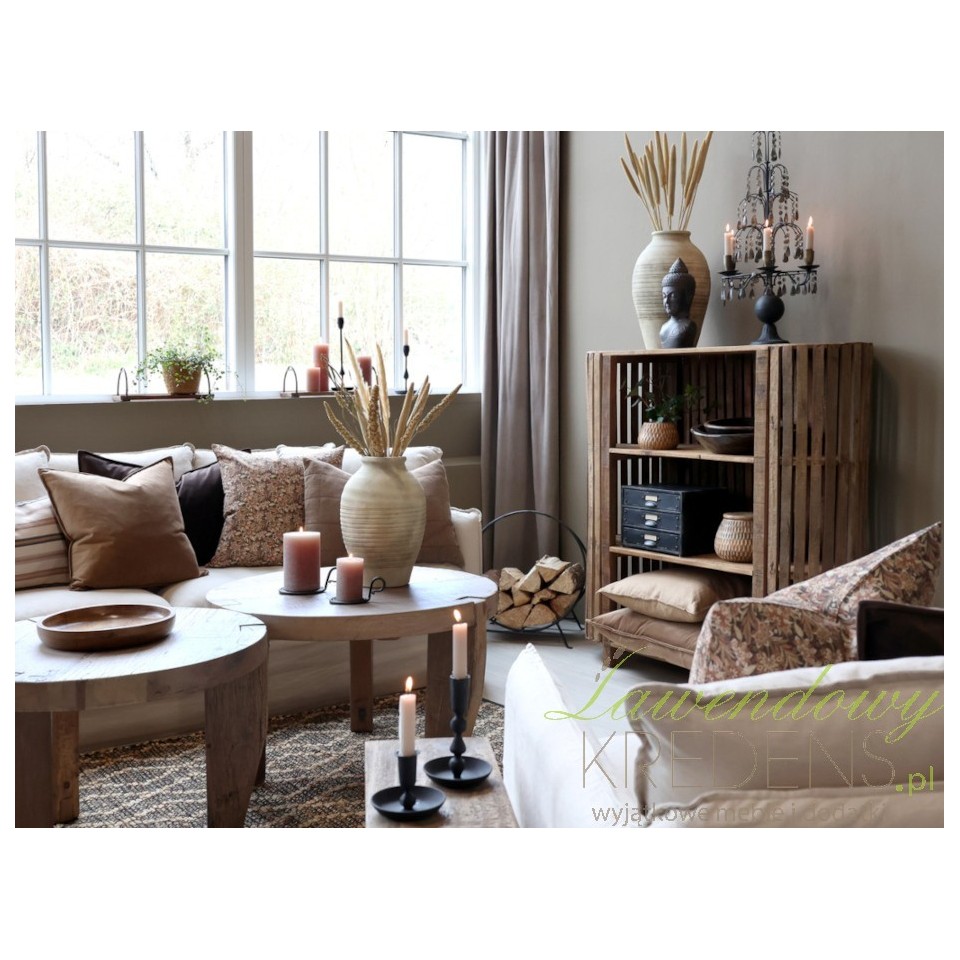 To nie jest gładki, anonimowy świecznik. Widoczna patyna, ciemny metal i zwisające elementy przypominające kryształy tworzą efekt „starego żyrandola” w wersji stołowej. Taki detal świetnie gra ze stylem shabby chic, francuskim vintage, rustykalnym drewnem i rzemieślniczymi teksturami (len, ceramika, plecionki). Gdy zestawisz go z lustrem w postarzanej ramie lub z bukietem suszonych traw, uzyskasz spójną, dopracowaną scenę – bez wrażenia przypadkowości.