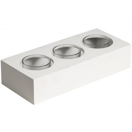 Świecznik w stylu prowansalskim, został uformowany w kształt prostopadłościanu i pomalowany na śnieżno-biały kolor. Wewnątrz przedmiotu, znajdują się trzy otwory ze szklanymi, wyjmowanymi wkładami, przeznaczonymi do umieszczenia w nich świec. Świecznik wygląda skromnie, ale właśnie ta prostota dodaje mu uroku. Polecamy inne dodatki prowansalskie!