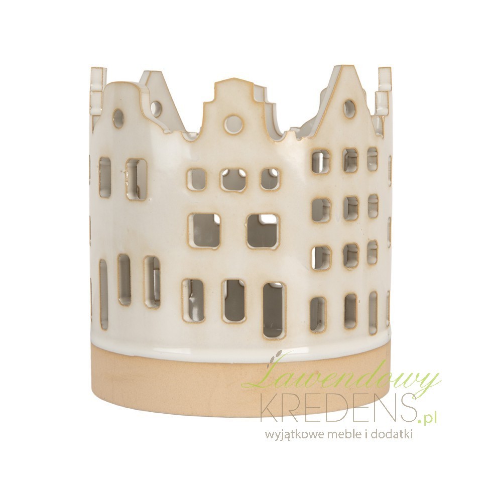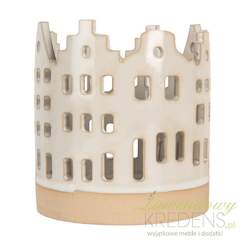 Lampion na tealight w formie okrągłego domku Clayre & Eef to dekoracja, która wprowadza do wnętrza przytulność i wyjątkową atmosferę. Wykonany z ceramiki, zachwyca subtelnym beżowym kolorem i detalami w postaci starannie wyciętych okienek, przez które wydobywa się ciepłe światło świecy. To nie tylko ozdoba, ale także element, który zmienia charakter całego pomieszczenia.