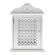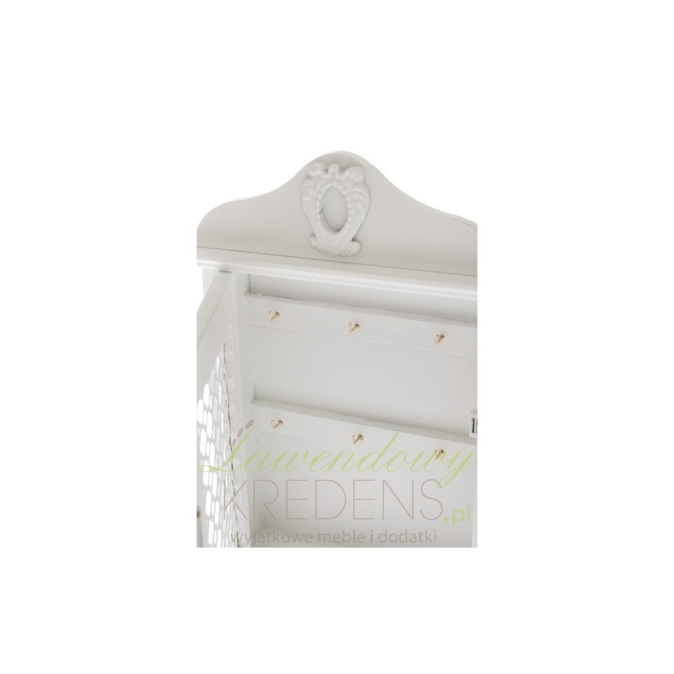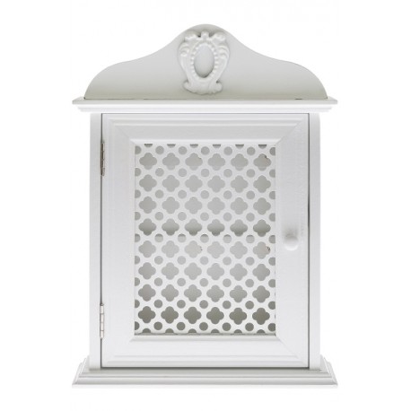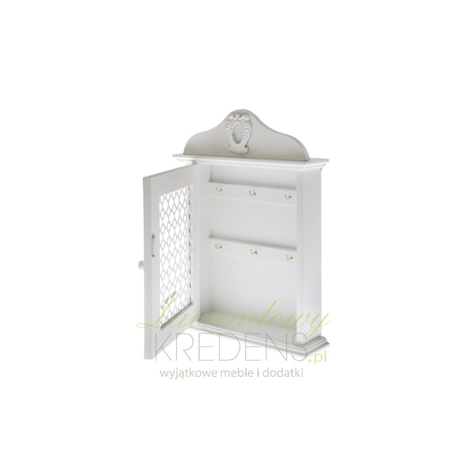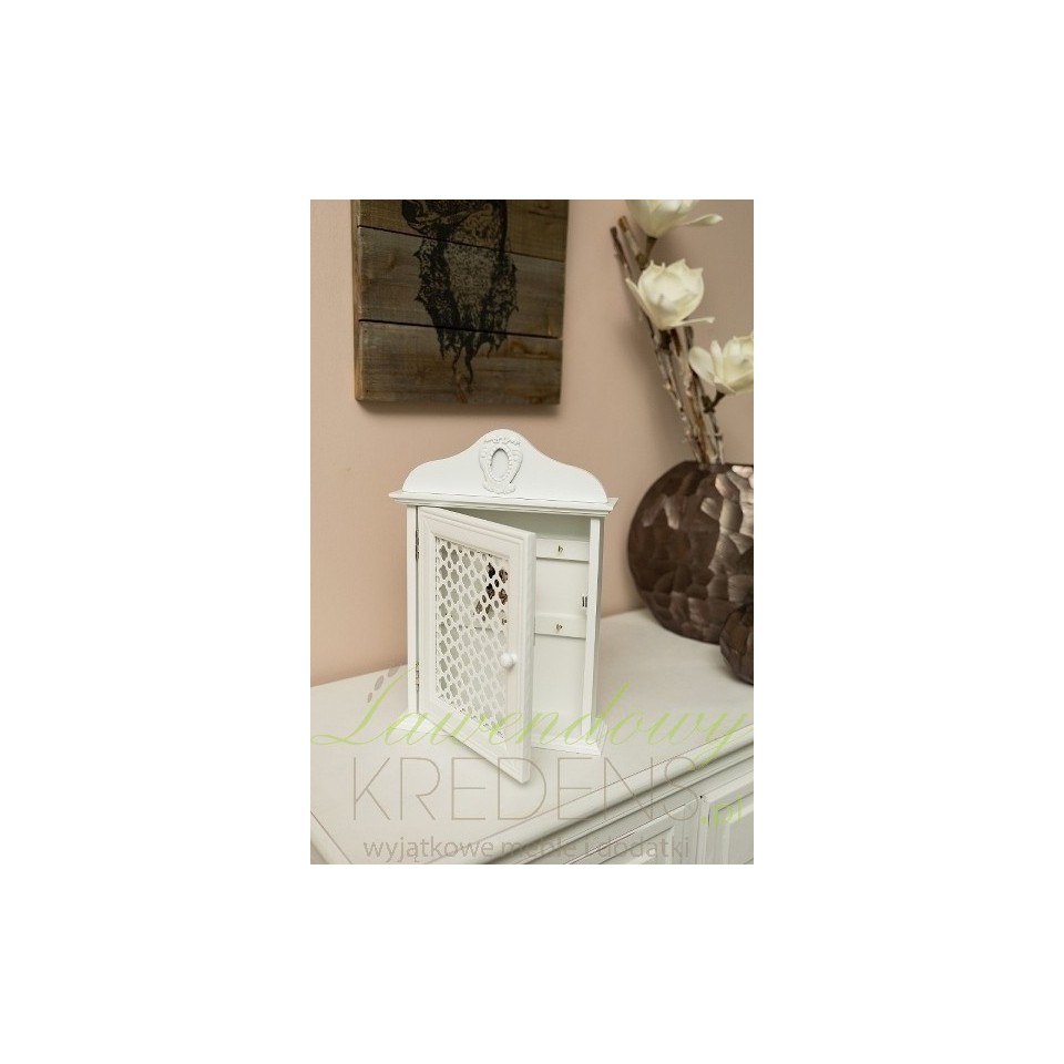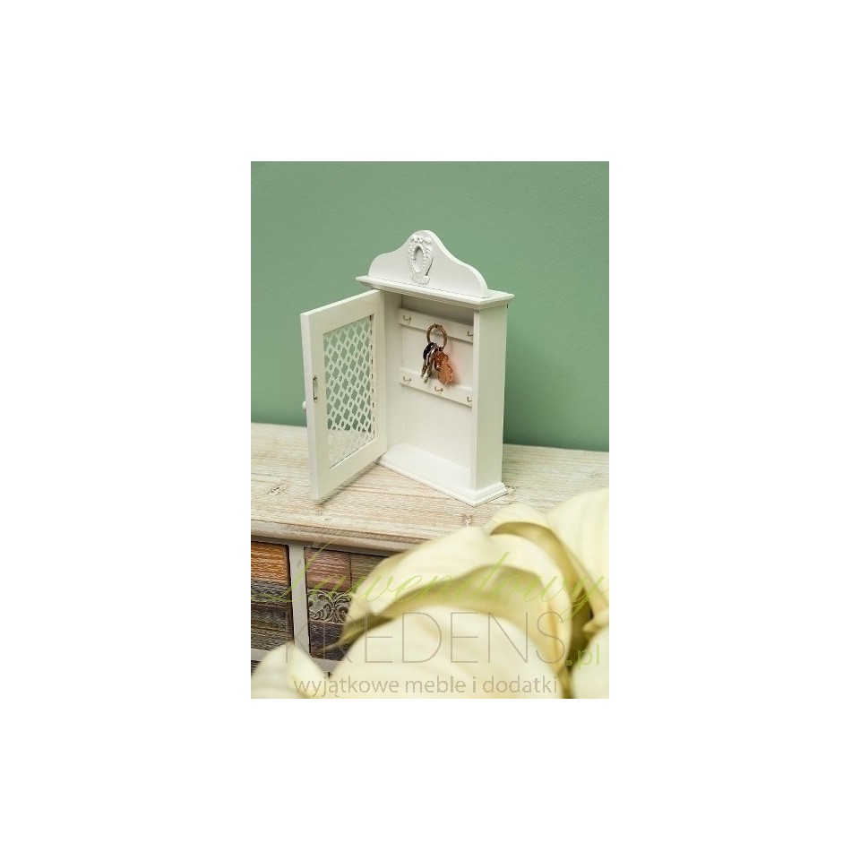 Biała, prowansalska szafka na klucze z licznymi haczykami, zamykana na umieszczonych na zawiasach drzwiczkach, dzięki którym klucze nie wypadną. Dekoracyjny charakter obudowy ma jednocześnie wkomponować się w otoczenie, z drugiej strony przypominać o zachowaniu porządku i odkładaniu kluczy na miejsce!