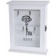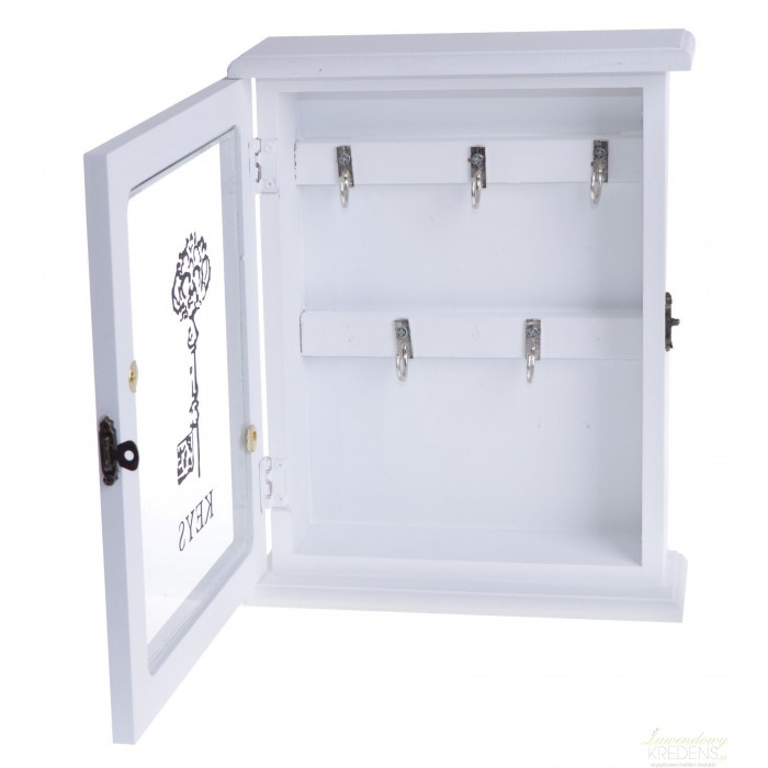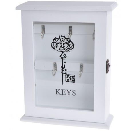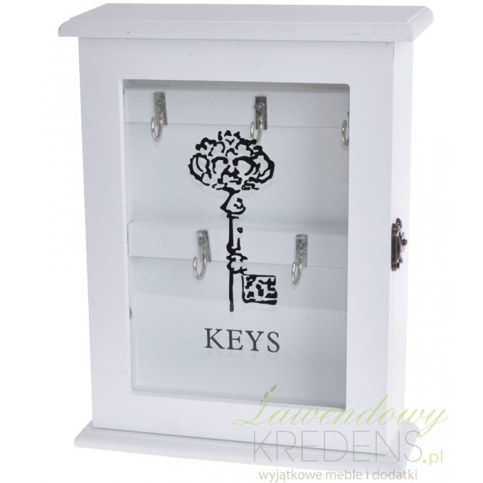 Zamykana szafka na klucze to pewność, że wszystko jest na swoim miejscu. Wewnątrz skrzynki na klucze znajdują się dwa rzedy haczyków, które odsłaniają przeszklone drzwi. Na przeszkolonych drzwiach naniesiono ozdobną, czarną grafikę dużego klucza. Szafki na klucze zamykane na mały zamek to potrzebne detale w każdym dobrze zorganizowanym domu lub biurze.