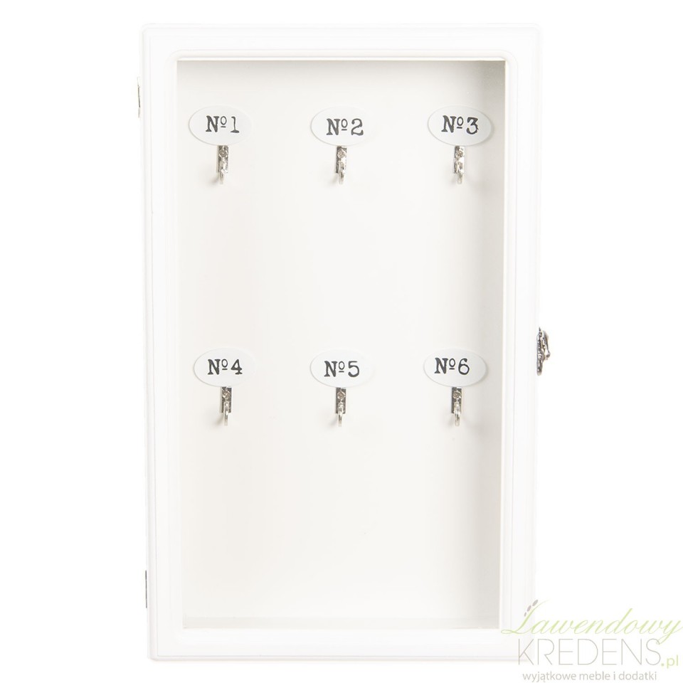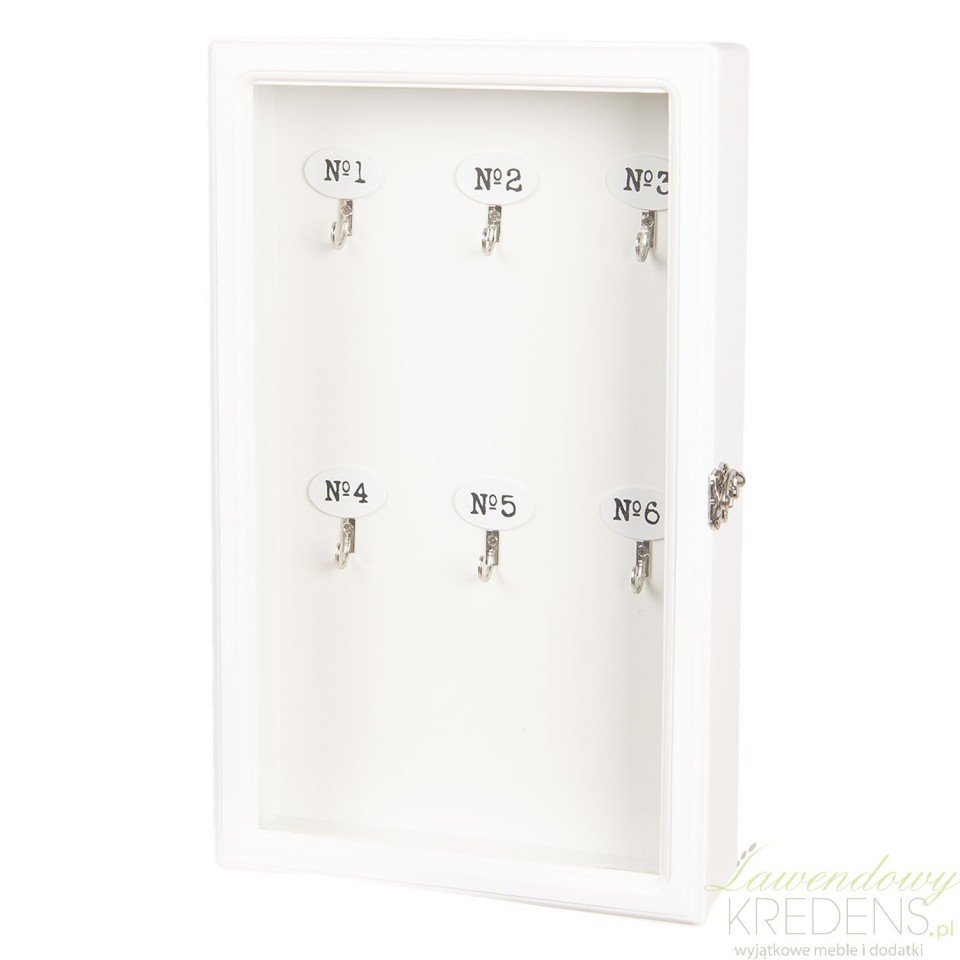 Wykonana z drewna i szkła szafka na klucze oraz inne drobiazgi sprawdzi się w każdym domu. Biała szafka pasuje zarówno do przedpokoju, jak również do garażu i do recepcji w małym pensjonacie. Drewniana szafka zabezpieczy zawartość przed kurzem i pomoże utrzymać porządek w kluczach. Estetyczne wykonanie i oznaczenia haczyków za pomocą numerów z pewnością zrobią na każdym dobre wrażenie.