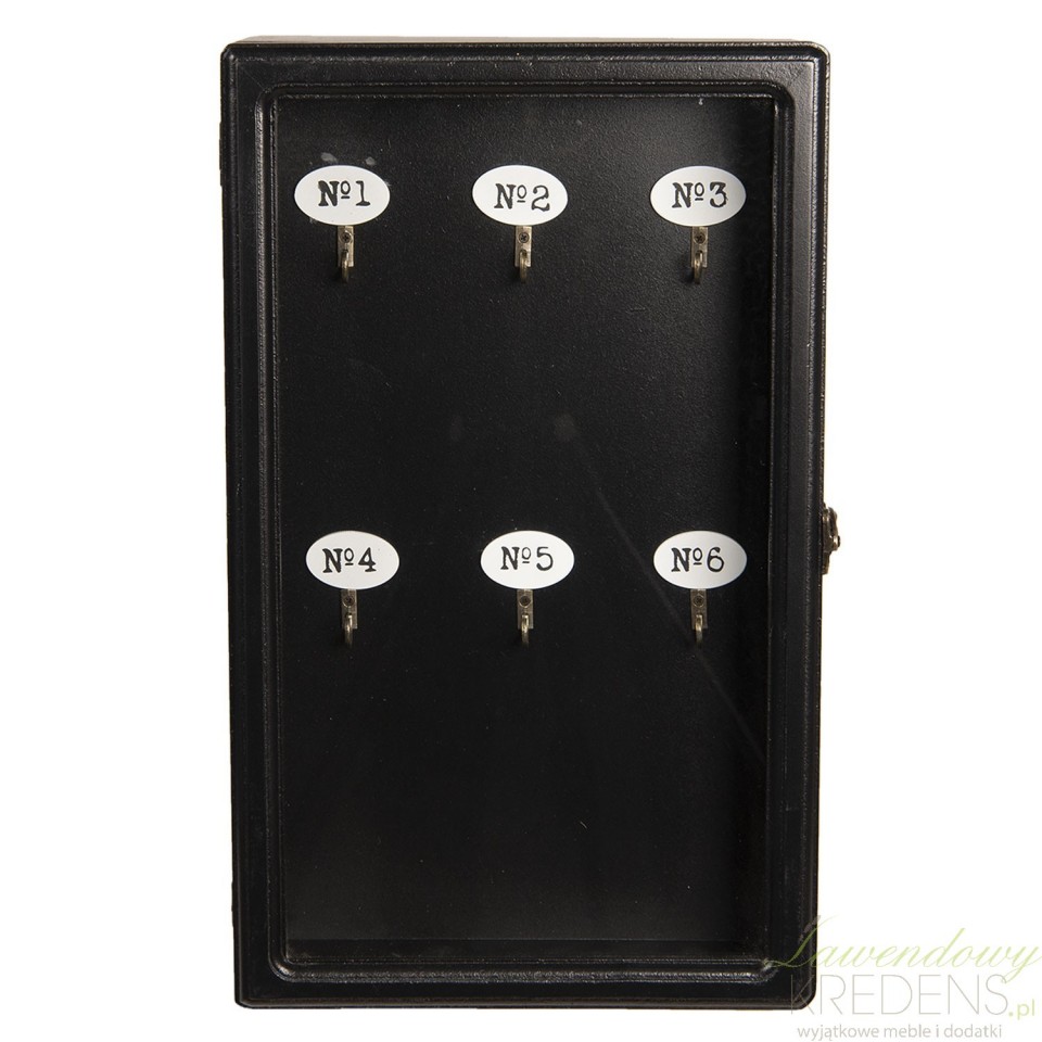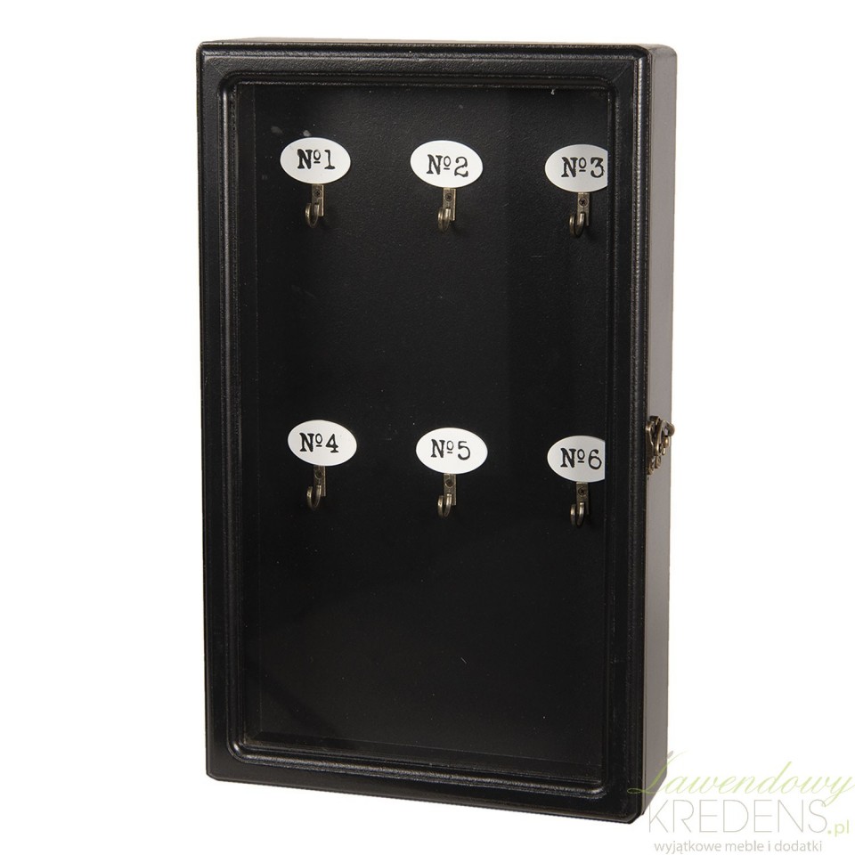 Czarna szafka na klucze to produkt godny polecenia do każdego domu! Przeszklona szafka z drewnianymi ścianami pozwoli ocenić jej zawartość bez potrzeby otwierania zamka. Wewnątrz znajduje się sześć metalowych haczyków na klucze oznaczonych białymi tabliczkami. Szafki na klucze od Clayre&Eef to najpraktyczniejsze dodatki do przedpokoju i korytarza!