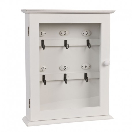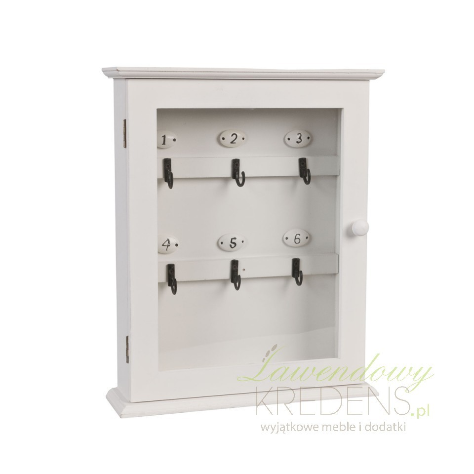 Przepiękna, klasyczna szafka na klucze, to zamykana przeszklonymi drzwiczkami szafka prowansalska w kolorze białym. Dzięki zamknięciu klucze na spadną na podłogę lub półkę, natomiast przeszklone drzwi pozwolą w każdym momencie kontrolować stan wiszących w szafce kluczy. Szafki na klucze z numerowanymi wieszaczkami w prosty sposób pozwolą Ci zapanować nad problemem zagubionych kluczy!
