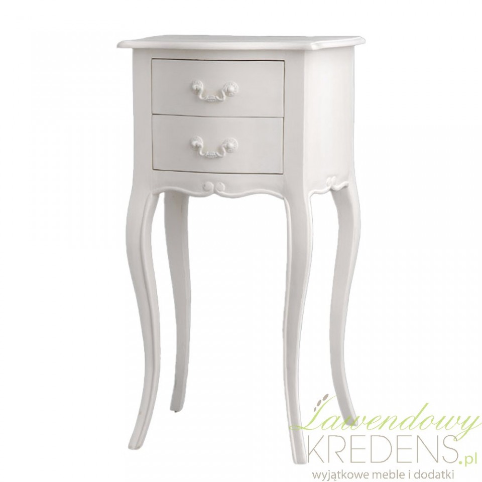 Zgrabnie wyprofilowany stolik z szufladami, który elegancko dopełni Twoją przestrzeń. Biała powierzchnia stolika będzie doskonale wyglądac zarówno w salonie jako stolik na kwiaty, w sypialni jako stolik nocny czy w holu jako stolik na klucze. Meble francuskie to wyjątkowość, elegancja i użyteczność w każdym calu!
