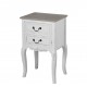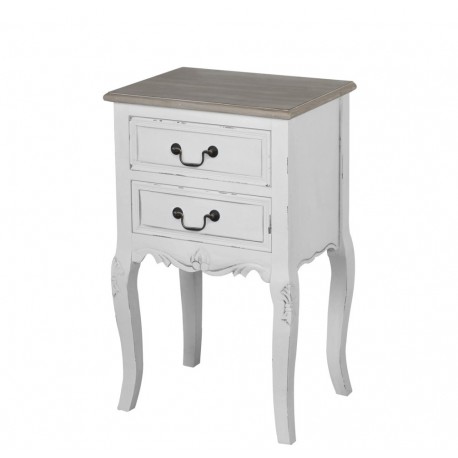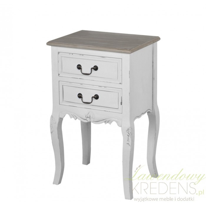 Stolik nocny w stylu prowansalskim o standardowej wysokości 67 centymetrów ma bielony blat brązowy i dwie praktyczne szufladki.