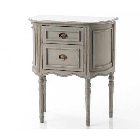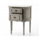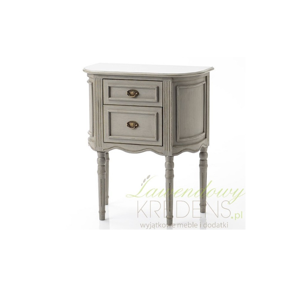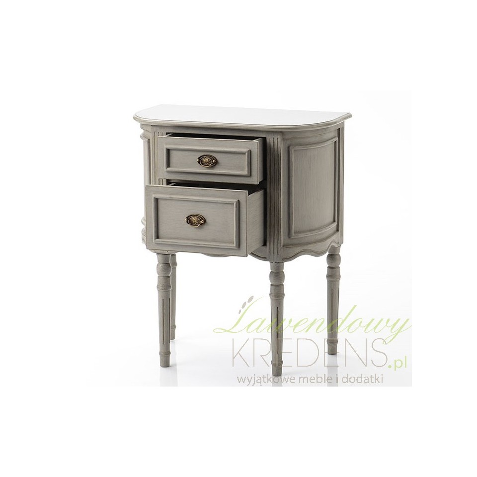 Elegancki styl oraz dwie szuflady sprawiają, że szafka nocna w stylu francuskim jest niezastąpionym elementem wyposażenia wnętrza sypialni. Jej blat posiada zaokrąglone krawędzie i podobnie jak cały mebel ma szary kolor. Niebanalny kształt, frezowania i smukłe nogi nie tylko zapewniają stabilność ale gwarantują również styl o jakim od dawna marzysz. Francuska szafka nocna najlepiej sprawdzi się w pokoju gościnnym i w sypialni.