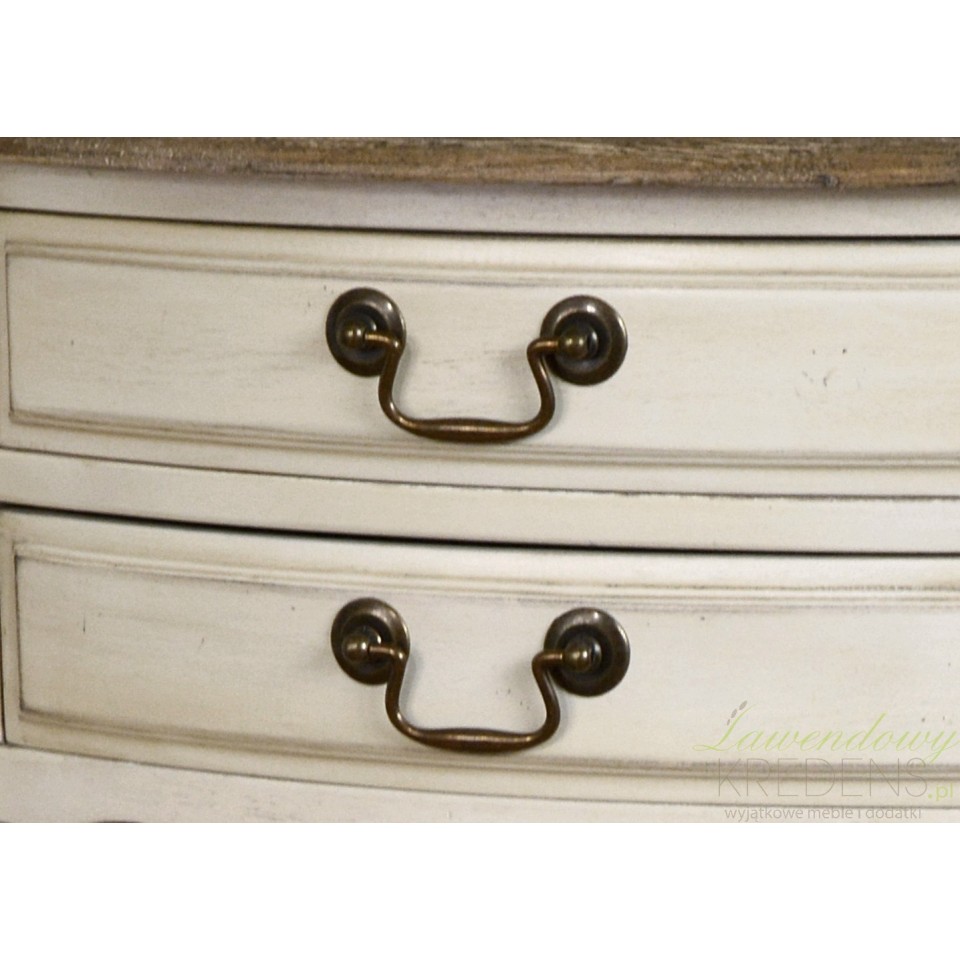 Postarzany stolik nocny z drewna brzozy ma jasny, stonowany kolor, który przepięknie łączy się z brązowym blatem o matowej fakturze.