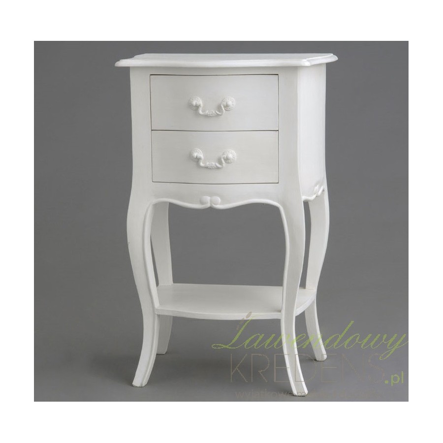 Przpiękny stolik nocny w stylu francuskim Apolla z drewnem akacji jest malowany na jasnokremowy kolor i ma 65 cm wysokości.