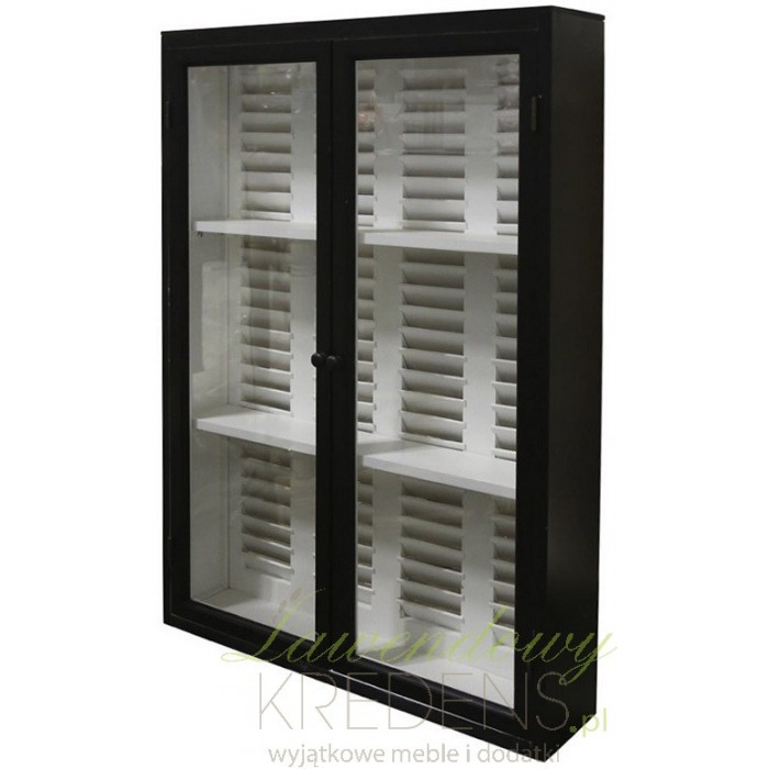 Duża, wisząca szafka marki Chic Antique. Powierzchnia szafki malowana na czarno komponuje się idealnie z jasnymi żaluzjami wewnątrz szafki. Za przeszklonymi drzwiczkami z czarnymi galkami znajdują się dwie białe półeczki. Szafka zachwyca prostotą i urokiem, ale poza walorami estetycznymi ma również ogrom walorów użytkowych.