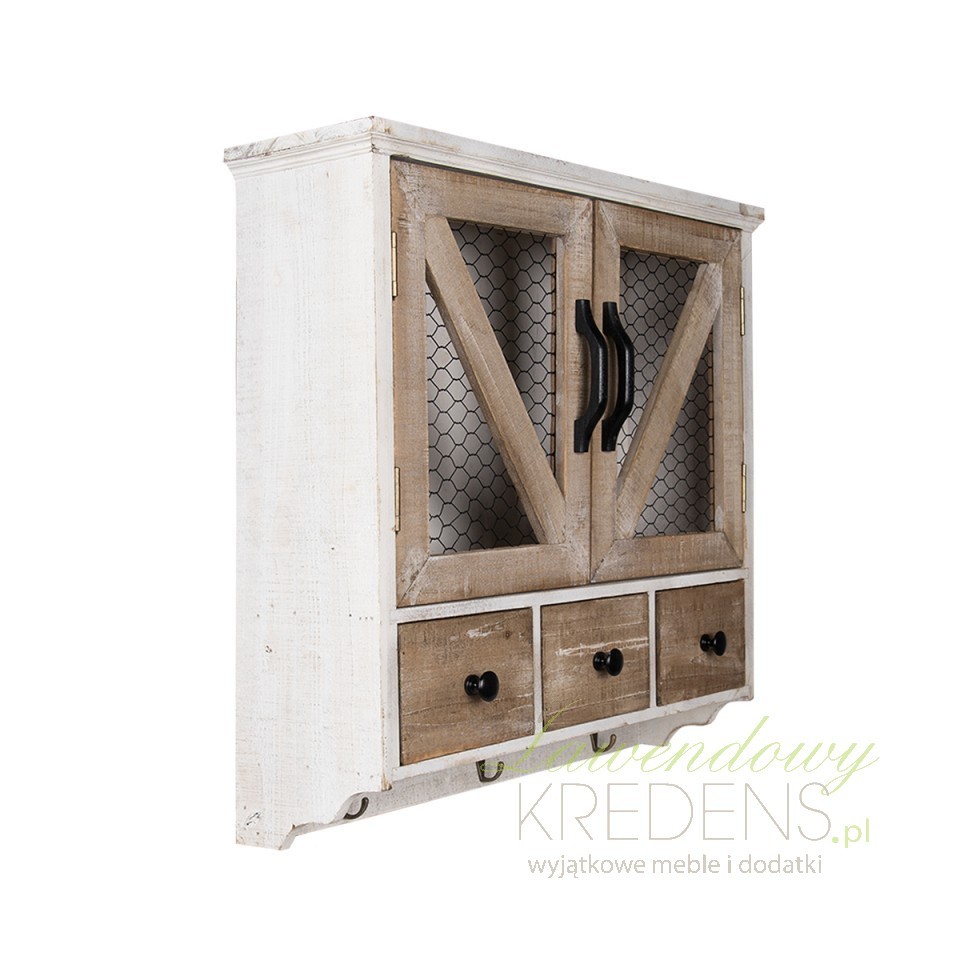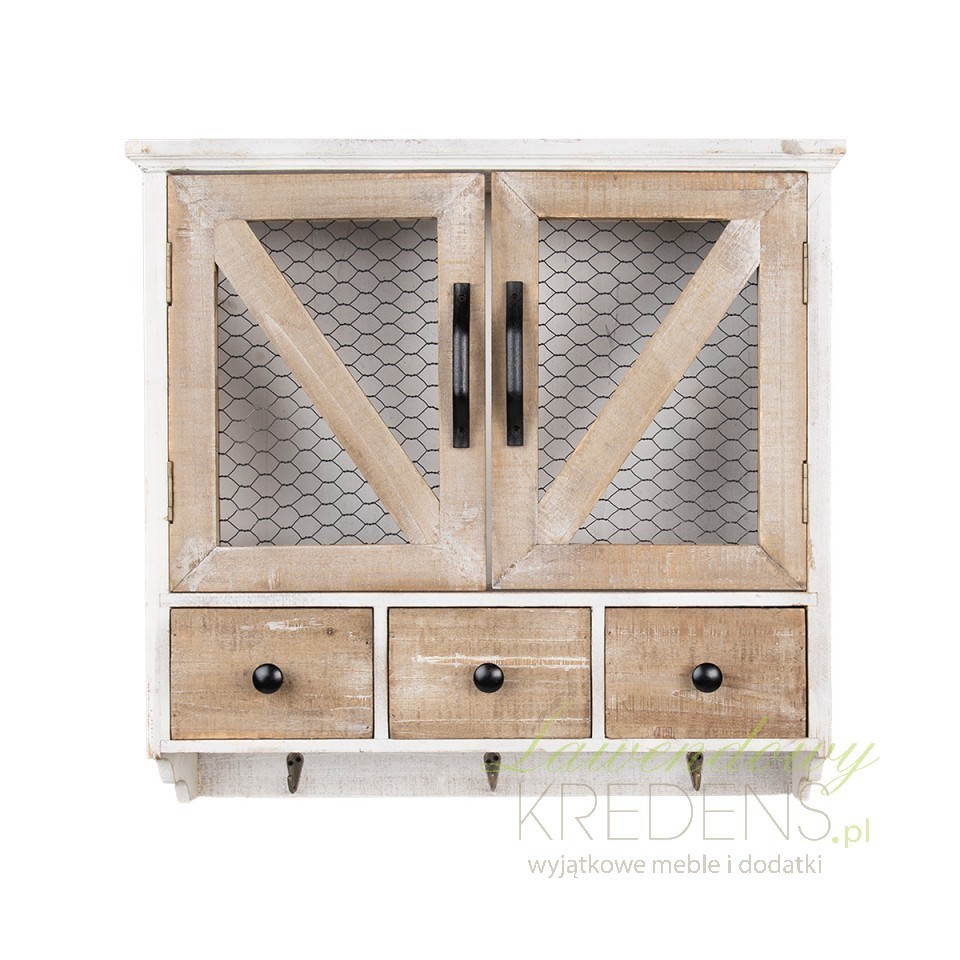 Dzięki prezentowanej szafce, każda strefa w Twoim domu może w końcu zostać odpowiednio uporządkowana. Ta biała szafka ścienna prowansalska z wieszaczkami ma brązowe fronty drzwi i szuflad oraz matowe uchwyty i gałki w kolorze czarnym. Drzwi są podbite grubą siatką. Pod nimi znajdują się trzy niewielkie szuflady. Pod szufladami zamocowano haczyki. Połącz szafki ścienne prowansalskie z innymi meblami z kolekcji Clayre & Eef aby stworzyć zupełnie nową atmosferę w domu.