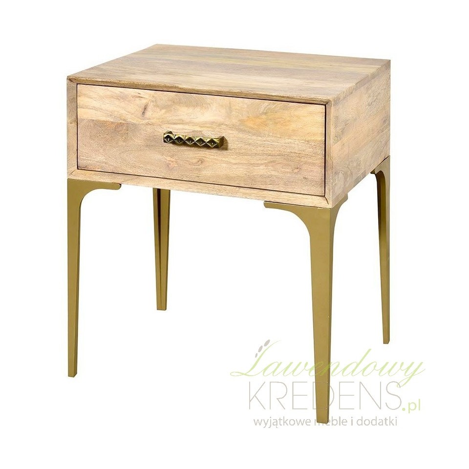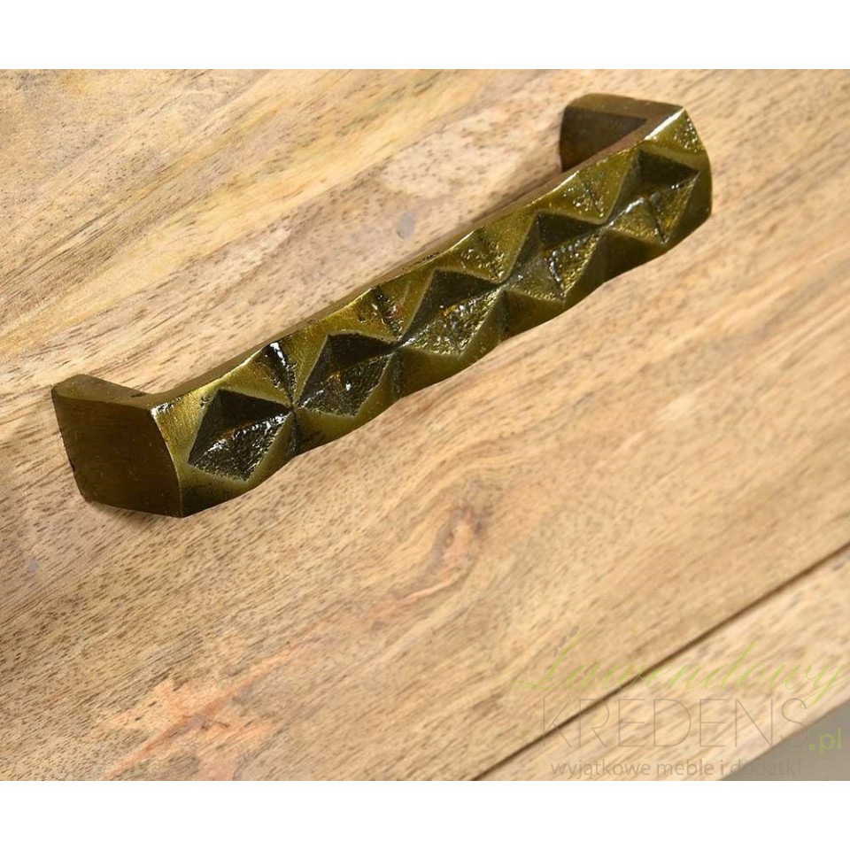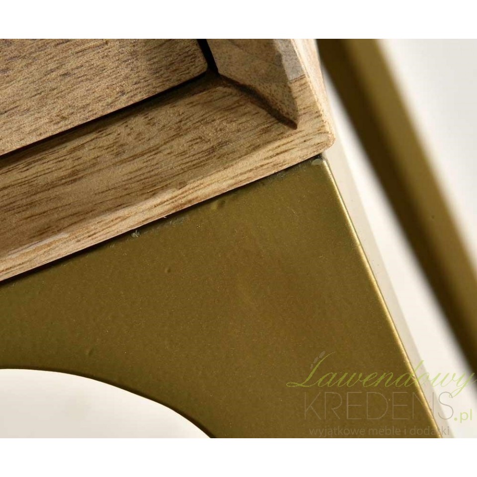 Szafka posiada jedną szufladę z pięknym, metalowym uchwytem w kolorze mosiądzu, który dodaje jej elegancji i subtelnego blasku. Uchwyty są nie tylko ozdobą, ale również praktycznym elementem, ułatwiającym codzienne użytkowanie.