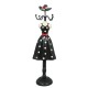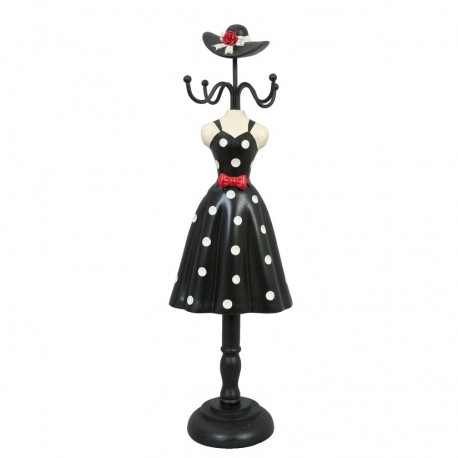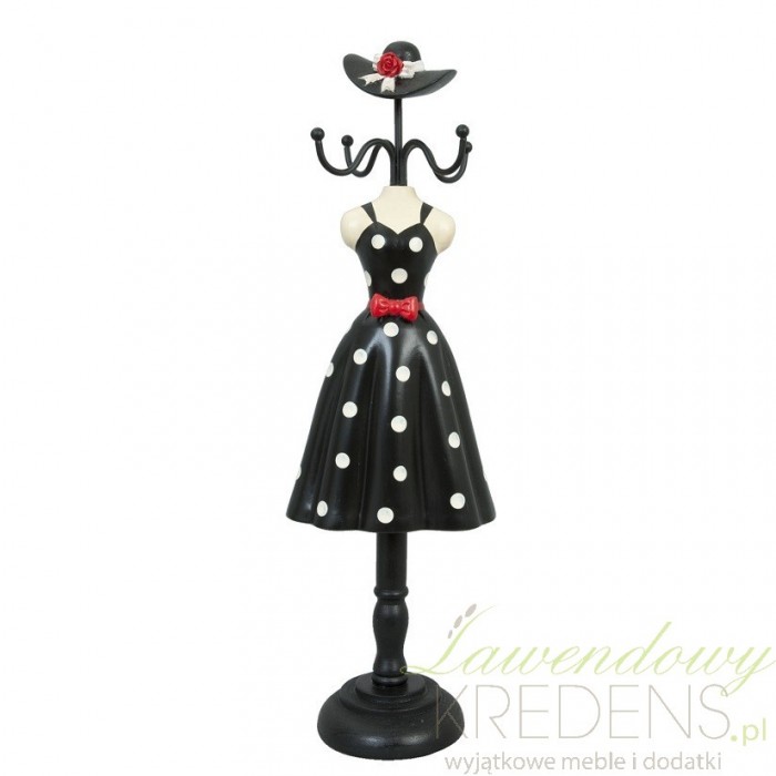 Stojak na biżuterię to manekin w kształcie sukienki w kolorze czarnym w białe groszki. Stojaczek na biżuterię wykonany został z metalu oraz tworzywa. Manekin na biżuterię zakończony jest czterema, wygiętymi haczykami dzięki którym wyeksponujesz wszystkie błyskotki. Stojak sprawi, że Twoja biżuteria lub inne kobiece dodatki będą uporządkowane w jednym miejscu, a problem z ich zagubieniem zniknie!