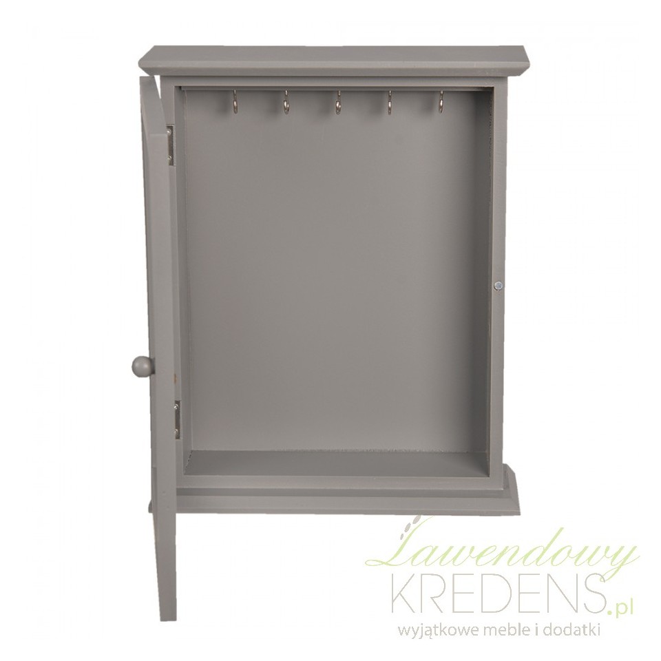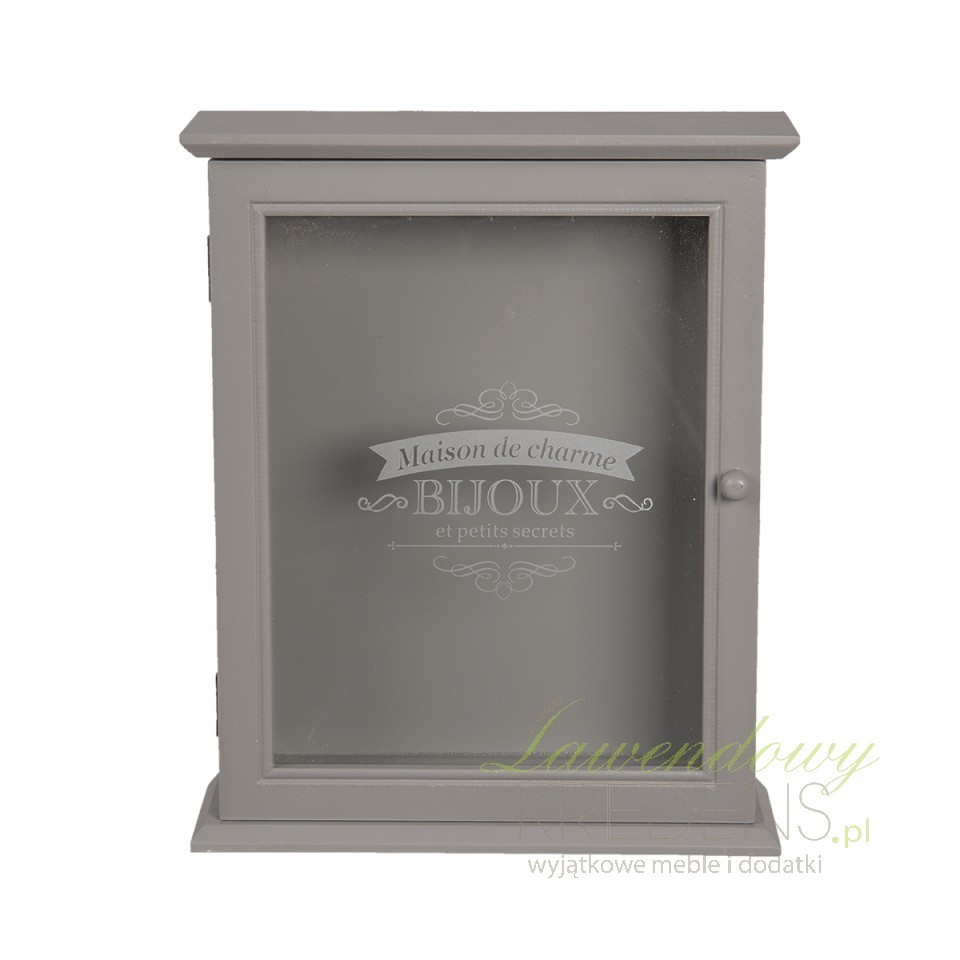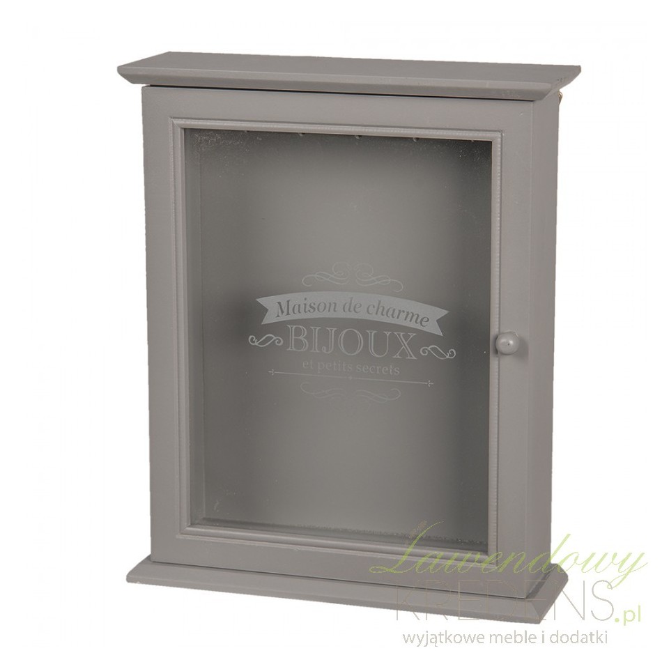 Szafka na biżuterię w stylu prowansalskim to najlepsze miejsce na wyjątkowe skarby. Zamykana szafka wykonana z drewna pozwala na organizację naszyjników, bransoletek i kolczyków. Wewnątrz szafki znajdują się metalowe, zamocowane w górnej części haczyki, dzięki czemu nawet najbardziej dekoracyjne łańcuszki nie splączą się. Drzwi szafki na klucz sa przeszklone i wyposażone w okrągły uchwyt.