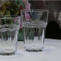 Wykonane z białego szkła szklanki w stylu prowansalskim, ozdobione fantastycznym wzorem na wysokości środka ucha. Szklanki te równie dobrze sprawdzą się do napojów gorących jak i do owocowych czy mlecznych koktajli i shake'ów. Poczuj się jak w prawdziwej prowansalskiej restauracji z Chic Antique!