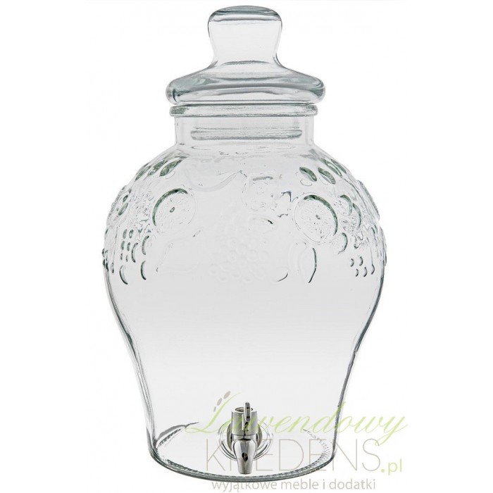 Szklany słoik na napoje posiadający pojemność 10L i delikatne zdobienie u góry. Ten słoik z kranikiem przyda się dla osób robiących na przykład grilla na działce, dzięki niemu polanie napoju stanie się przyjemnością.