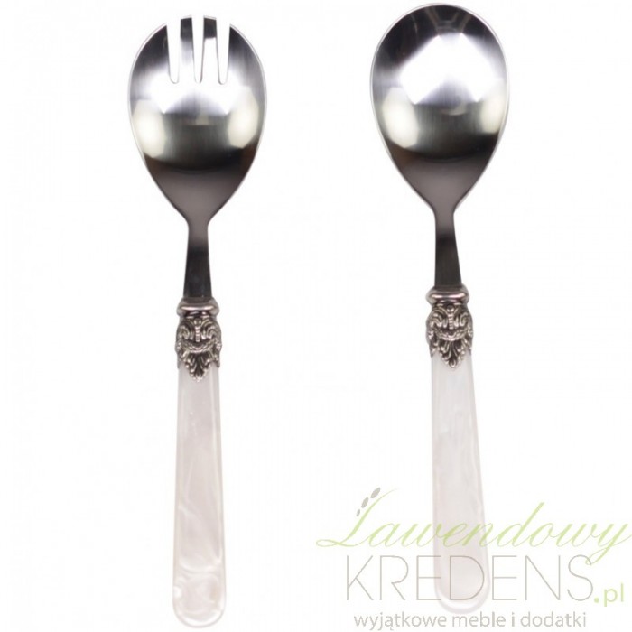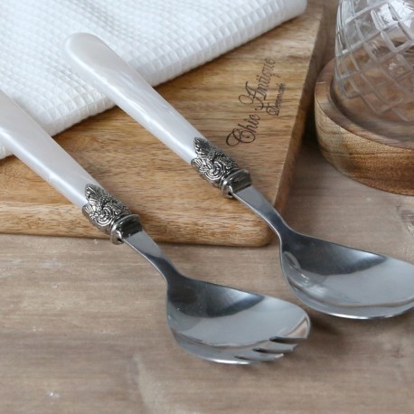 Zestaw dwóch łyżek do sałaty jest wykonany z metalu. Jasne uchwyty z barokowymi okuciami dodają sztućcom antycznego wyrazu. Jedna z łyżek jest zaokrąglona, a druga ma ząbki. Łyżki do sałaty Chic Antique nadadzą całej zestawie odrobiny elegancji i luksusu.