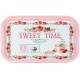 Praktyczne dodatki do kuchni to istotne elementy dla każdej gospodyni domu. Metalowa taca w stylu retro wprowadzi klimat z minionych lat. Taca retro zapewni komfort podawania posiłków i napoi. Jest różowa, na środku ma angielski napis SWEET TIME, który może kojarzyć się ze słodką chwilą relaksu i przyjemności oraz obraz filiżanki w prawym dolnym rogu. Całość dopełnia ramka utworzona z małych różyczek.
