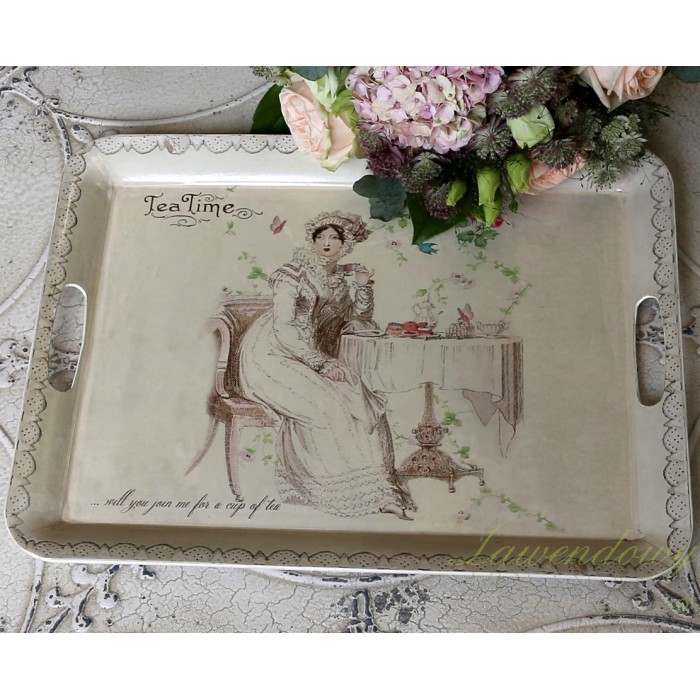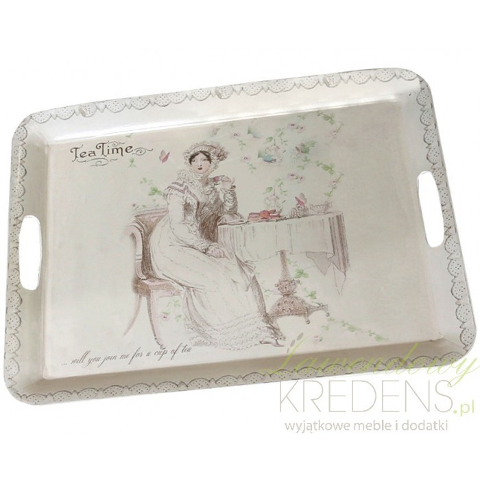 Dodatki w stylu prowansalskim stanowią niewielkie, ale jakże istotne elementy wyposażenia kuchni czy innych pokoi. Taca prowansalska firmy Chic Antique ma kształt prostokąt z dwoma uchwytami do trzymania. Na jasnym tle namalowana jest kobieta przy stoliku i angielski napis Tea Time(Czas na herbatkę). To świetny dodatek właśnie na popołudniową herbatkę spędzoną w miłym towarzystwie.