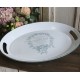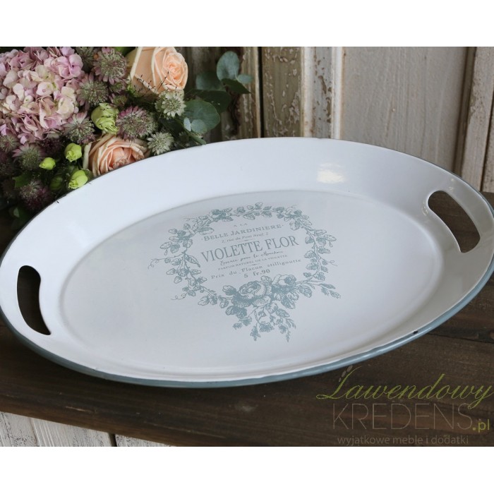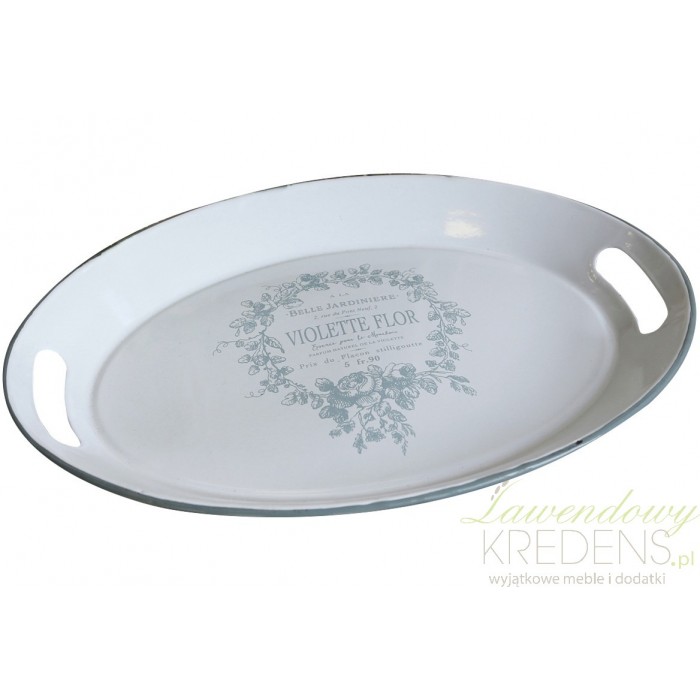 Dodatki w stylu prowansalskim odmienią twoje mieszkanie i sprawią, że stanie się ono niepowtarzalne i jedyne w swoim rodzaju. Taca prowansalska firmy Chic Antique z kolekcji Provence Chic ma owalny kształt i biały kolor. Na środku znajduje się ozdobny wieniec z kwiatów, a w środku francuskie napisy. Taca posiada po obu stronach wygodne uchwyty do przeniesienia.