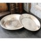 Okrągły talerz z mosiądzu z wysoką, skośnie uformowaną krawędzią, która ozdobnie otacza płaskie dno. Dodatkowo na całej powierzchni widoczne są eliptyczne wklęśnięcia, które pięknie odbijają światło światło padające na powierzchnię talerza!